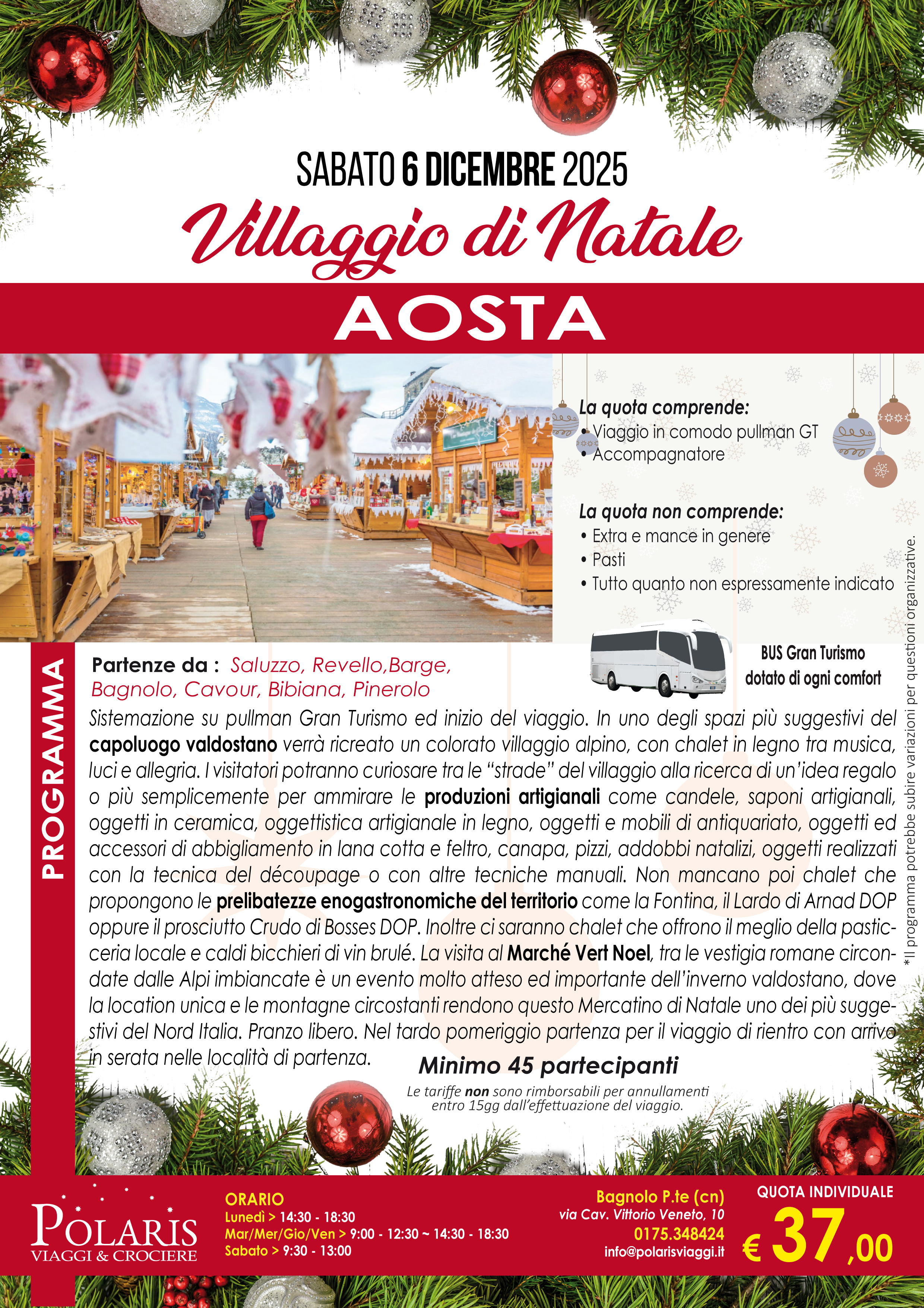 Sistemazione su pullman Gran Turismo ed inizio del viaggio. In uno degli spazi più suggestivi del capoluogo valdostano verrà ricreato un colorato villaggio alpino, con chalet in legno tra musica, luci e allegria. I visitatori potranno curiosare tra le “strade” del villaggio alla ricerca di un’idea regalo o più semplicemente per ammirare le produzioni artigianali come candele, saponi artigianali, oggetti in ceramica, oggettistica artigianale in legno, oggetti e mobili di antiquariato, oggetti ed accessori di abbigliamento in lana cotta e feltro, canapa, pizzi, addobbi natalizi, oggetti realizzati con la tecnica del découpage o con altre tecniche manuali. Non mancano poi chalet che propongono le prelibatezze enogastronomiche del territorio come la Fontina, il Lardo di Arnad DOP oppure il prosciutto Crudo di Bosses DOP. Inoltre ci saranno chalet che offrono il meglio della pasticceria locale e caldi bicchieri di vin brulé. La visita al Marché Vert Noel,…