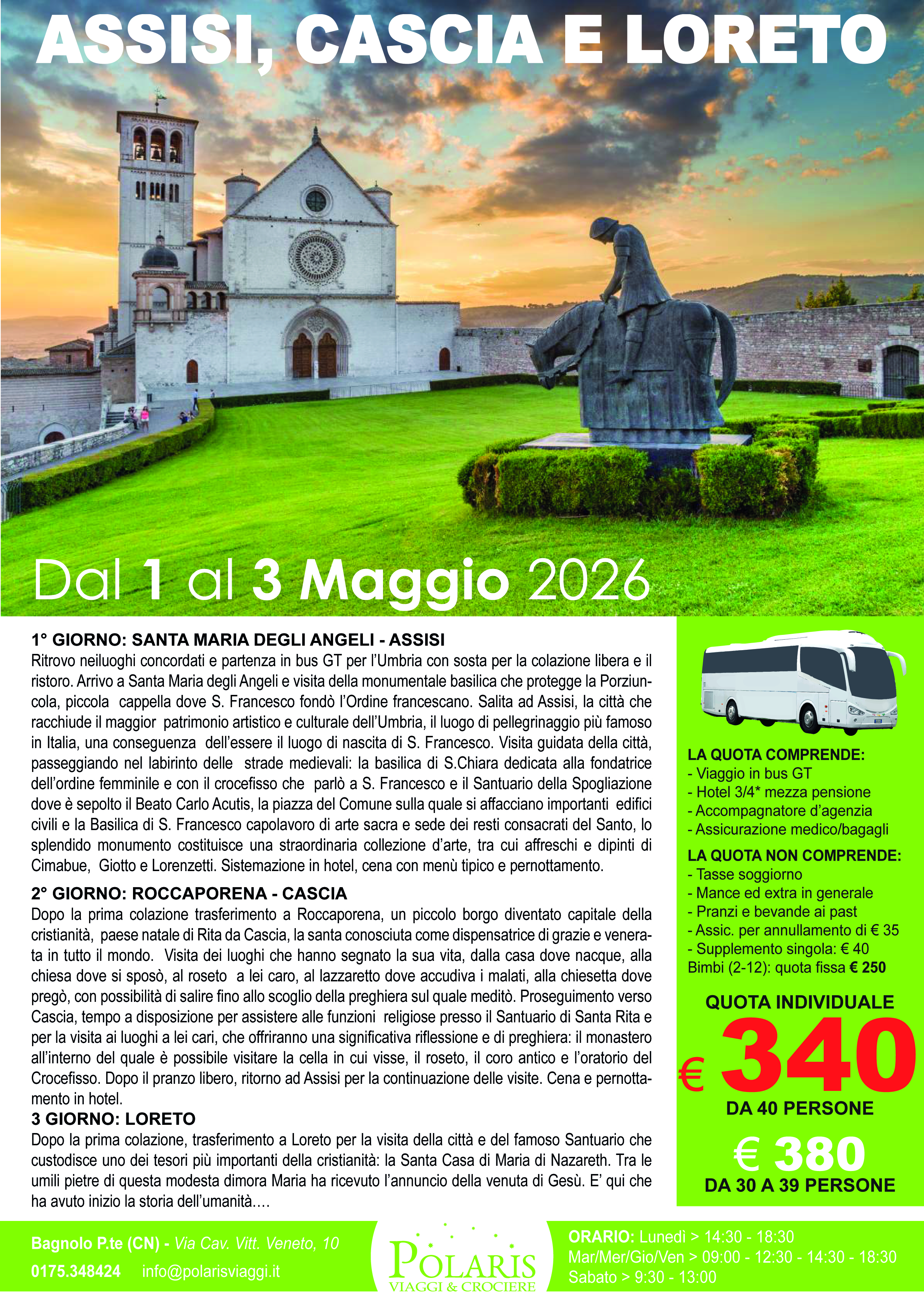 Ritrovo neiluoghi concordati e partenza in bus GT per l’Umbria con sosta per la colazione libera e il ristoro. Arrivo a Santa Maria degli Angeli e visita della monumentale basilica che protegge la Porziuncola, piccola cappella dove S. Francesco fondò l’Ordine francescano. Salita ad Assisi, la città che racchiude il maggior patrimonio artistico e culturale dell’Umbria, il luogo di pellegrinaggio più famoso in Italia, una conseguenza dell’essere il luogo di nascita di S. Francesco. Visita guidata della città, passeggiando nel labirinto delle strade medievali: la basilica di S.Chiara dedicata alla fondatrice dell’ordine femminile e con il crocefisso che parlò a S. Francesco e il Santuario della Spogliazione dove è sepolto il Beato Carlo Acutis, la piazza del Comune sulla quale si affacciano importanti edifici civili e la Basilica di S. Francesco capolavoro di arte sacra e se…