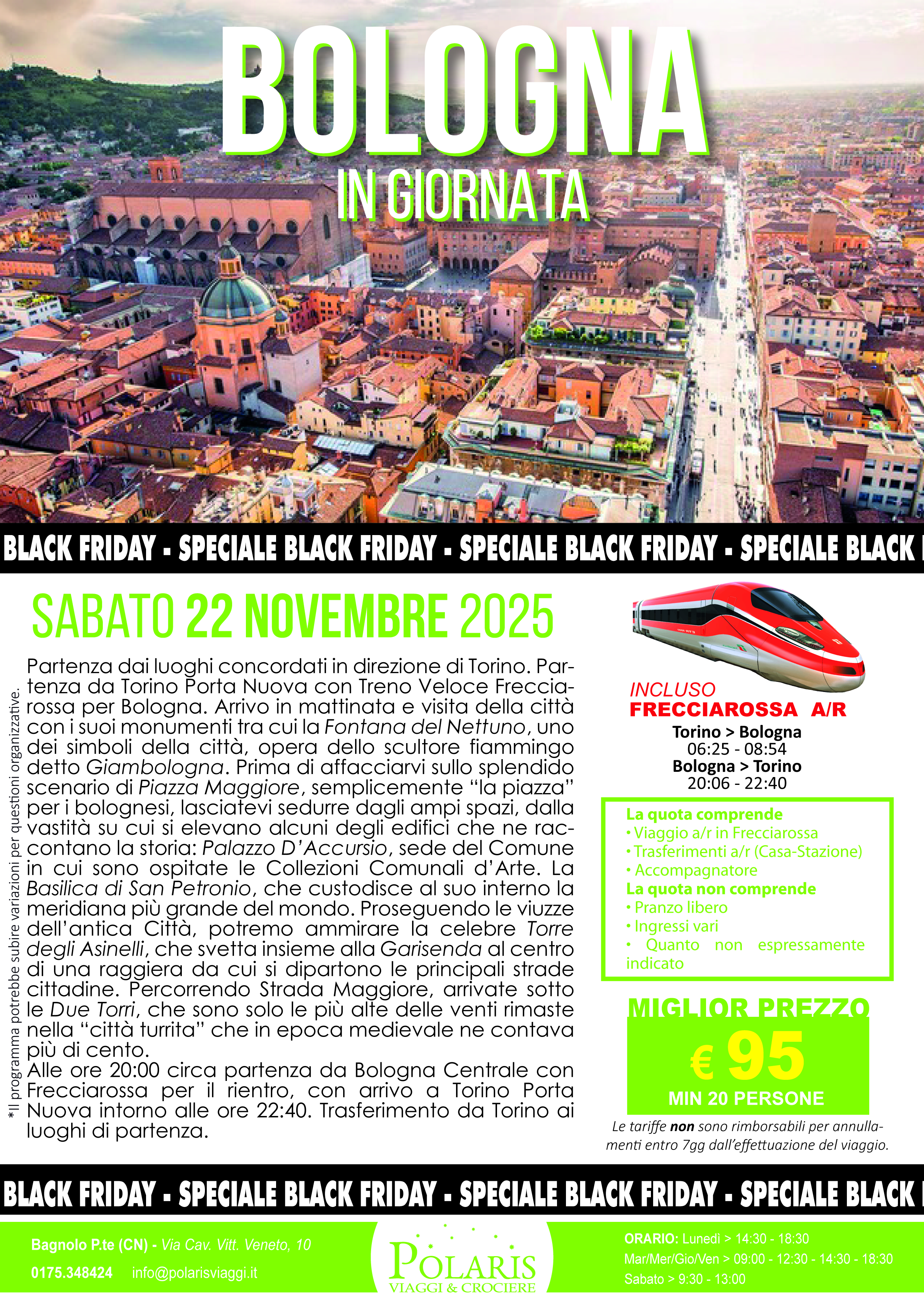 Partenza dai luoghi concordati in direzione di Torino. Partenza da Torino Porta Nuova con Treno Veloce Frecciarossa per Bologna. Arrivo in mattinata e visita della città con i suoi monumenti tra cui la Fontana del Nettuno, uno dei simboli della città, opera dello scultore fiammingo detto Giambologna. Prima di affacciarvi sullo splendido scenario di Piazza Maggiore, semplicemente “la piazza” per i bolognesi, lasciatevi sedurre dagli ampi spazi, dalla vastità su cui si elevano alcuni degli edifici che ne raccontano la storia: Palazzo D’Accursio, sede del Comune in cui sono ospitate le Collezioni Comunali d’Arte. La Basilica di San Petronio, che custodisce al suo interno la meridiana più grande del mondo. Proseguendo le viuzze dell’antica Città, potremo ammirare la celebre Torre degli Asinelli, che svetta insieme alla Garisenda al centro di una raggiera da cui si dipartono le principali strade cittadine. Percorrendo Strada Maggiore, arrivate sotto le…