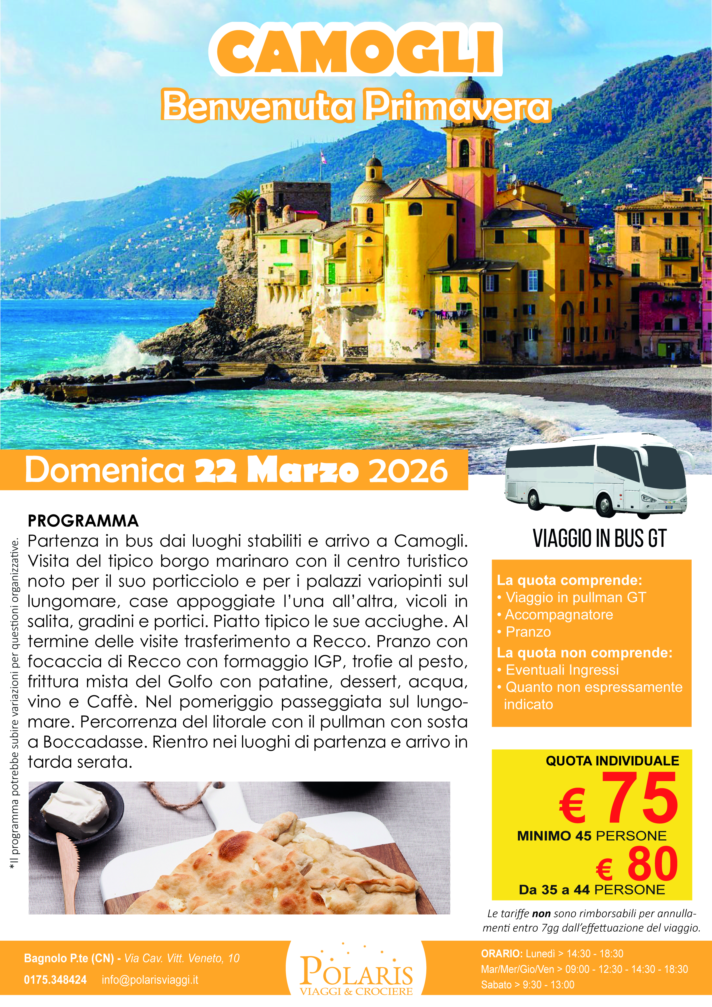Partenza in bus dai luoghi stabiliti e arrivo a Camogli. Visita del tipico borgo marinaro con il centro turistico noto per il suo porticciolo e per i palazzi variopinti sul lungomare, case appoggiate l’una all’altra, vicoli in salita, gradini e portici. Piatto tipico le sue acciughe. Al termine delle visite trasferimento a Recco. Pranzo con focaccia di Recco con formaggio IGP, trofie al pesto, frittura mista del Golfo con patatine, dessert, acqua, vino e Caffè. Nel pomeriggio passeggiata sul lungomare. Percorrenza del litorale con il pullman con sosta a Boccadasse. Rientro nei luoghi di partenza e arrivo in tarda serata.