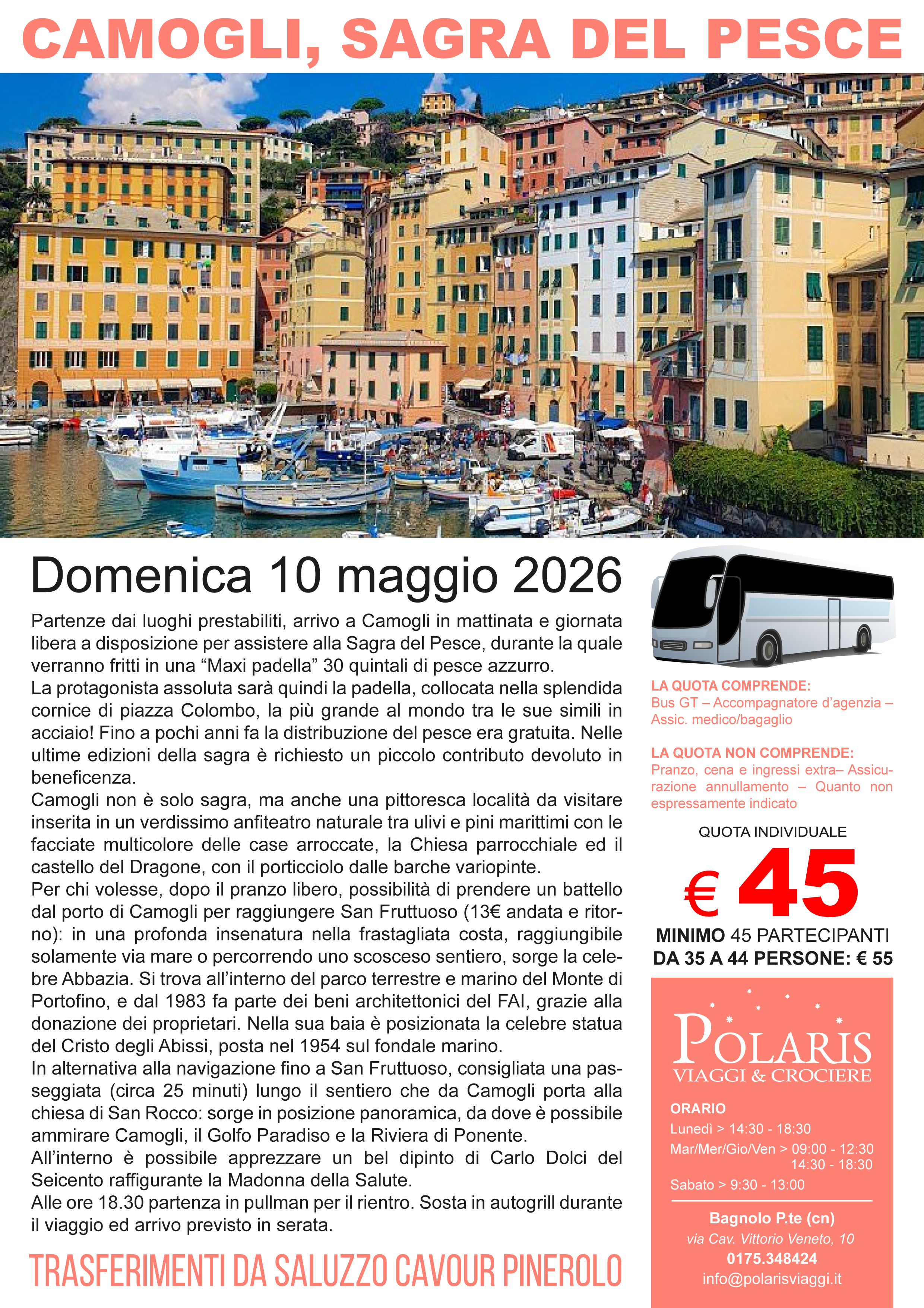 Partenze dai luoghi prestabiliti, arrivo a Camogli in mattinata e giornata libera a disposizione per assistere alla Sagra del Pesce, durante la quale verranno fritti in una “Maxi padella” 30 quintali di pesce azzurro.