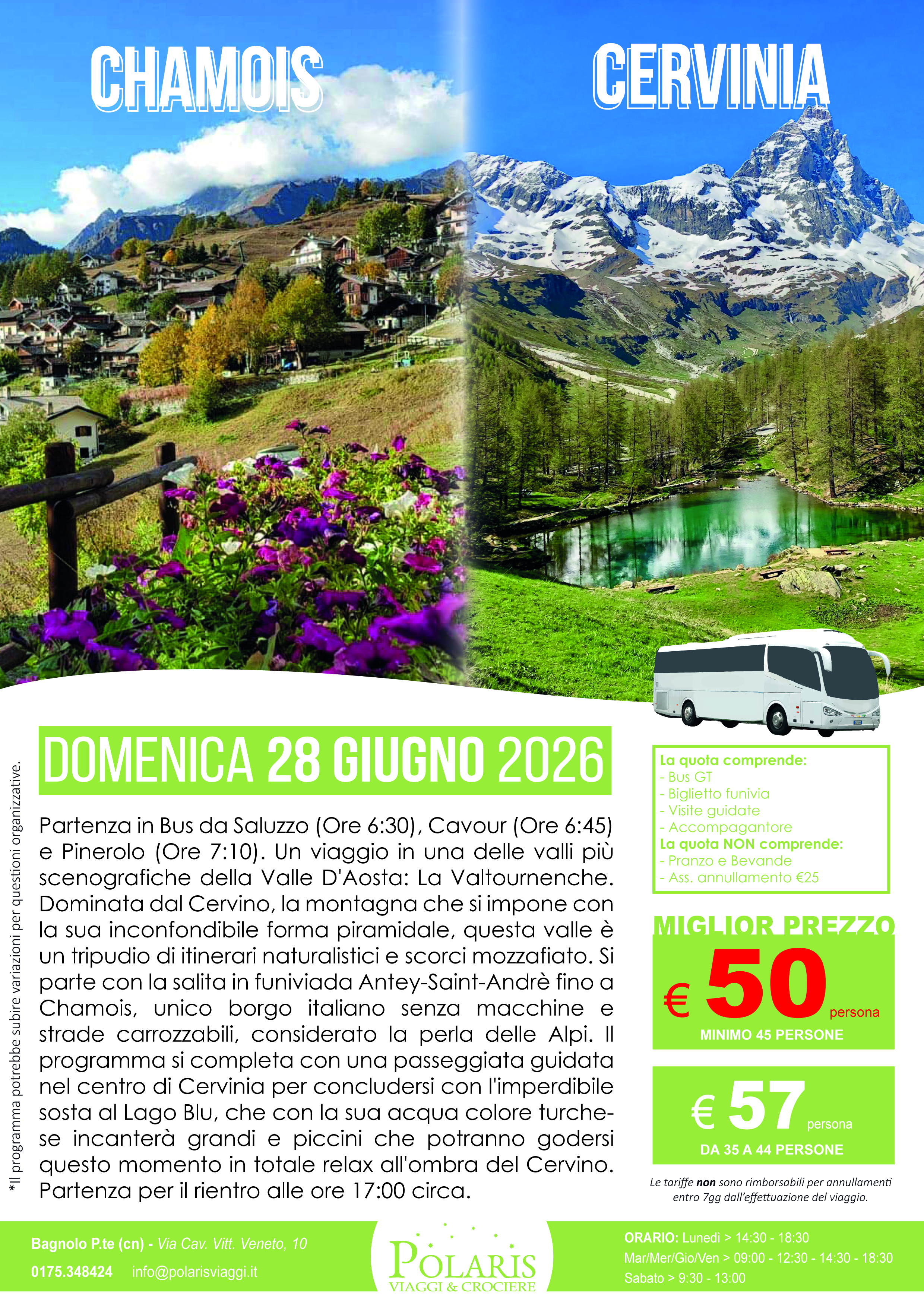 Partenza in Bus da Saluzzo (Ore 6:30), Cavour (Ore 6:45) e Pinerolo (Ore 7:10). Un viaggio in una delle valli più scenografiche della Valle D'Aosta: La Valtournenche. Dominata dal Cervino, la montagna che si impone con la sua inconfondibile forma piramidale, questa valle è un tripudio di itinerari naturalistici e scorci mozzafiato. Si parte con la salita in funiviada Antey-Saint-Andrè fino a Chamois, unico borgo italiano senza macchine e strade carrozzabili, considerato la perla delle Alpi. Il programma si completa con una passeggiata guidata nel centro di Cervinia per concludersi con l'imperdibile sosta al Lago Blu, che con la sua acqua colore turchese incanterà grandi e piccini che potranno godersi questo momento in totale relax all'ombra del Cervino. Partenza per il rientro alle ore 17:00 circa.