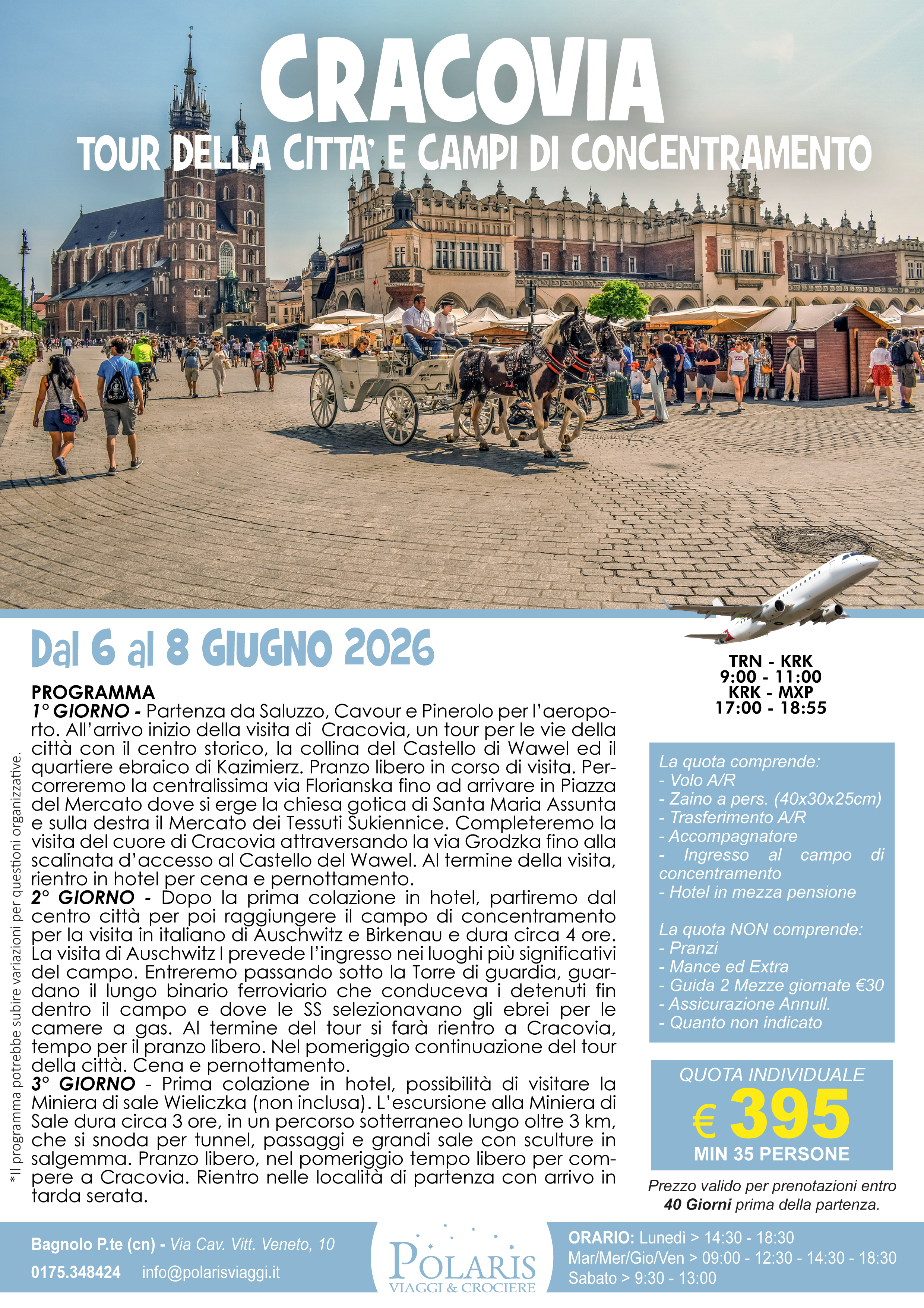 1° GIORNO - Partenza da Saluzzo, Cavour e Pinerolo per l’aeroporto. All’arrivo inizio della visita di Cracovia, un tour per le vie della città con il centro storico, la collina del Castello di Wawel ed il quartiere ebraico di Kazimierz. Pranzo libero in corso di visita. Percorreremo la centralissima via Florianska fino ad arrivare in Piazza del Mercato dove si erge la chiesa gotica di Santa Maria Assunta e sulla destra il Mercato dei Tessuti Sukiennice. Completeremo la visita del cuore di Cracovia attraversando la via Grodzka fino alla scalinata d’accesso al Castello del Wawel. Al termine della visita, rientro in hotel per cena e pernottamento.