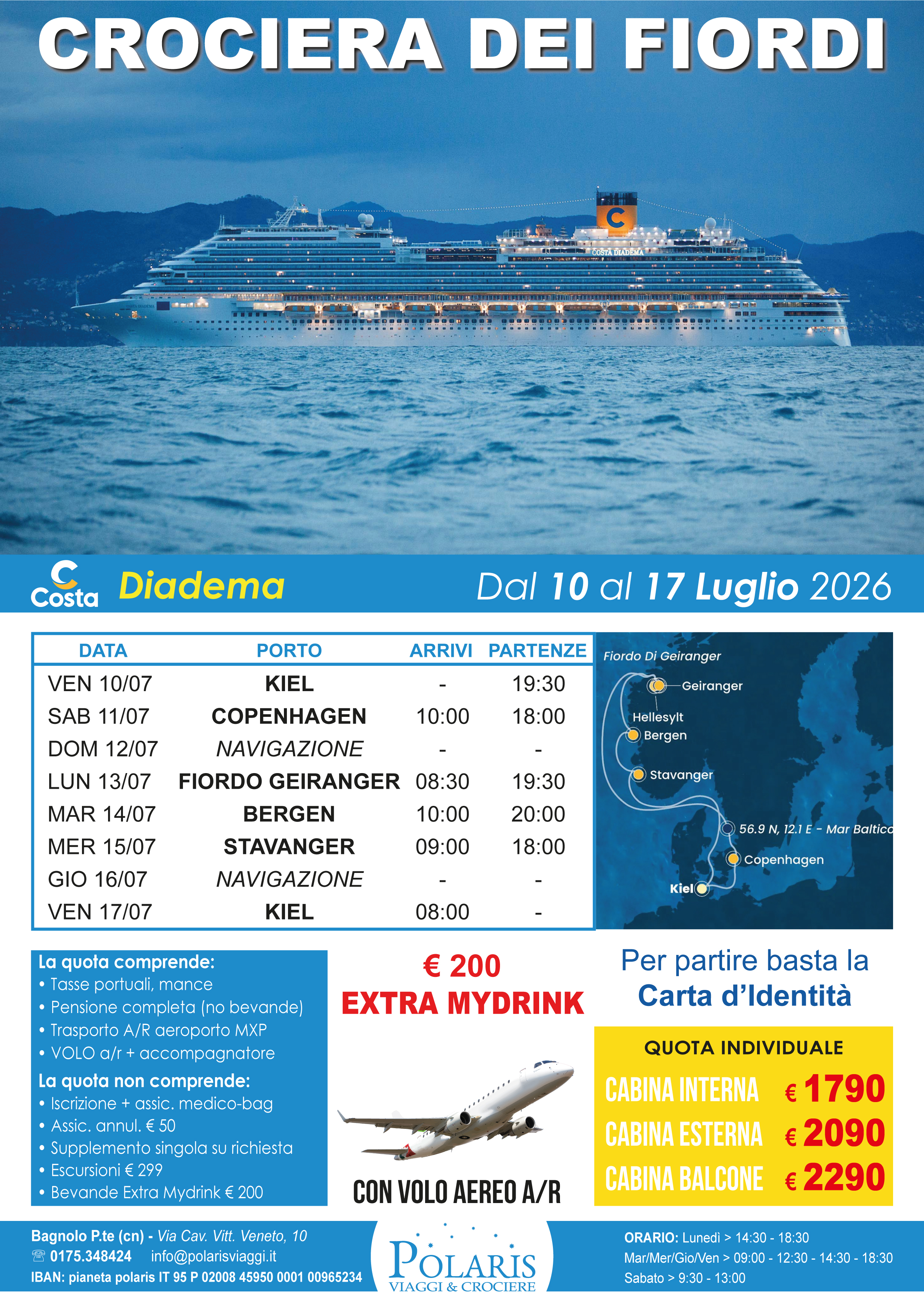PREZZO PER PERSONA: cab interna: € 1790 cab esterna: € 2090 cab balcone: € 2290