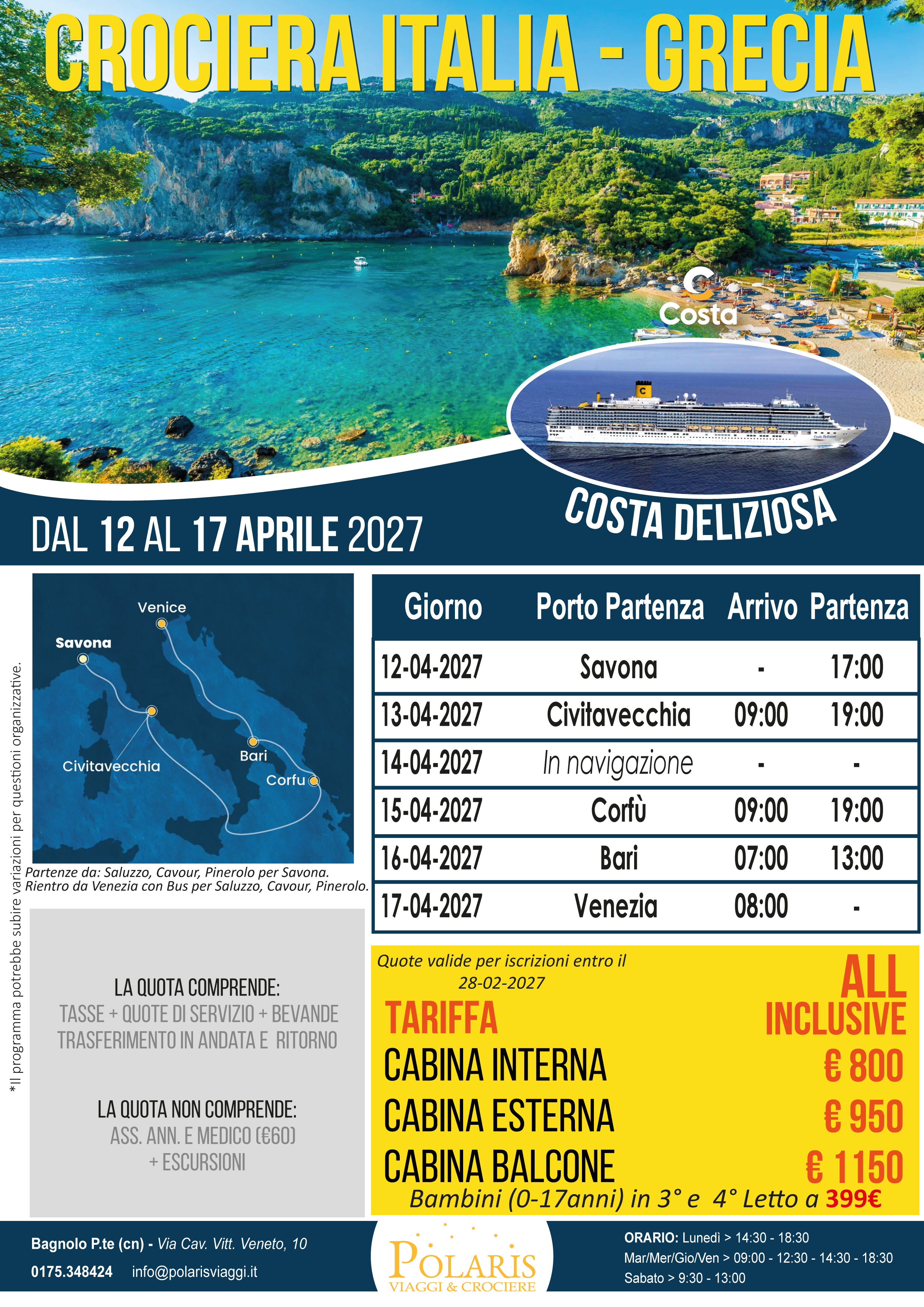 Il prezzo del biglietto è valido a titolo di acconto. Il saldo del viaggio può essere effettuato direttamente in agenzia o tramite Bonifico (IBAN: IT95P0200845950000100965234 - destinatario: PIANETA POLARIS DI BRUNO ALDO - causale: NOME E COGNOME + VIAGGIO + DATA VIAGGIO).
