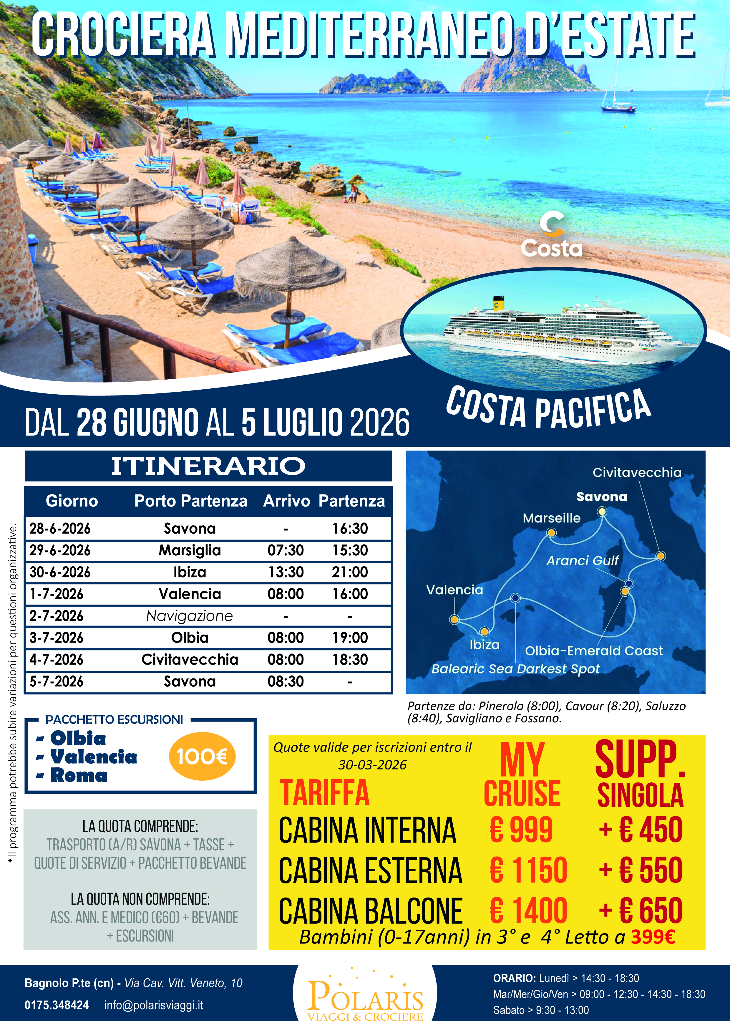 PREZZO PER PERSONA: Cab interna € 999 Cab esterna € 1150 Cab balcone € 1400