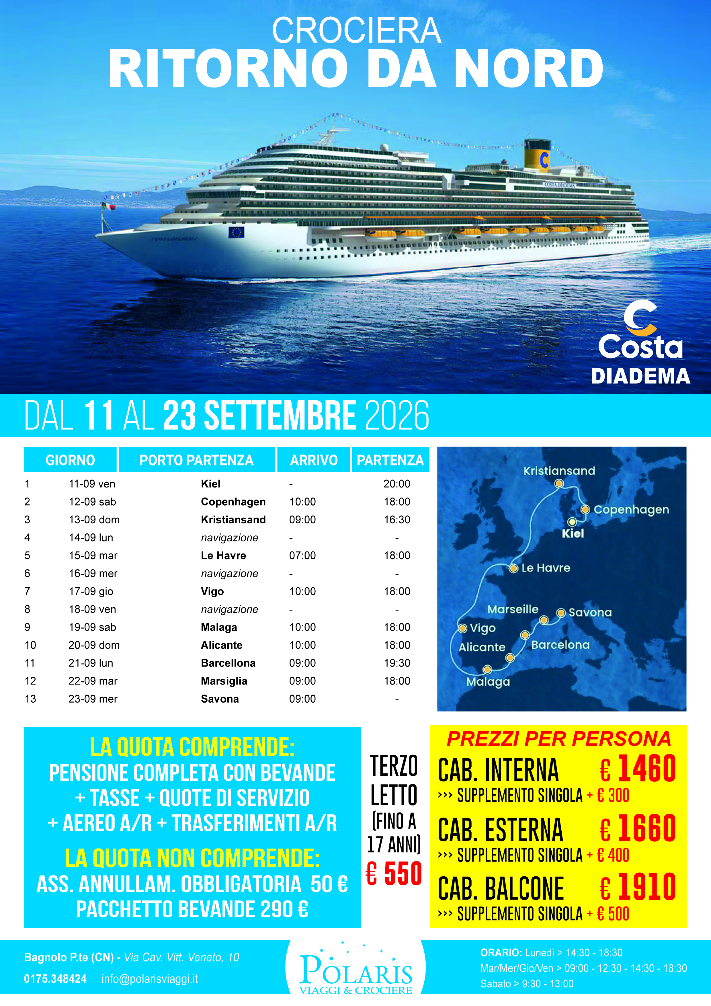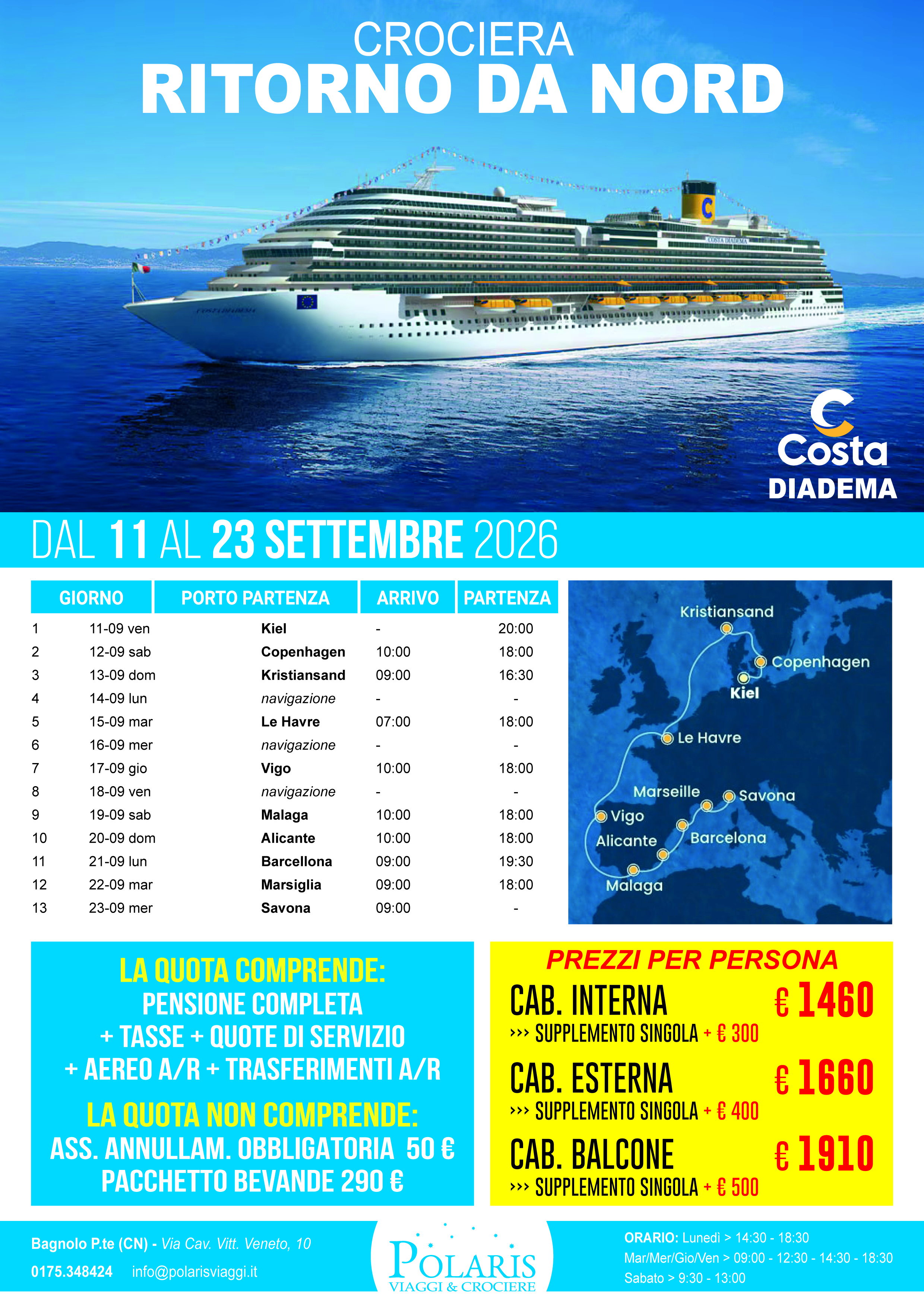 PREZZO PER PERSONA: Cab Interna € 1460 Cab Esterna € 1660 Cab Balcone € 1910