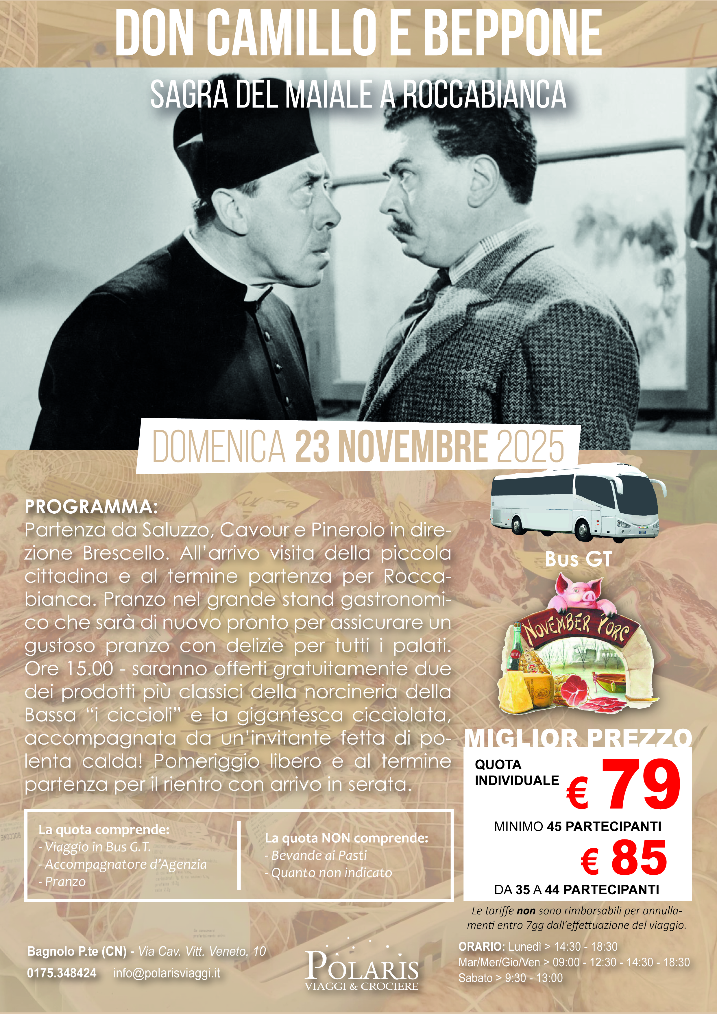 Partenza da Saluzzo, Cavour e Pinerolo in direzione Brescello. All’arrivo visita della piccola cittadina e al termine partenza per Roccabianca. Pranzo nel grande stand gastronomico che sarà di nuovo pronto per assicurare un gustoso pranzo con delizie per tutti i palati. Ore 15.00 - saranno offerti gratuitamente due dei prodotti più classici della norcineria della Bassa “i ciccioli” e la gigantesca cicciolata, accompagnata da un’invitante fetta di polenta calda! Pomeriggio libero e al termine partenza per il rientro con arrivo in serata.