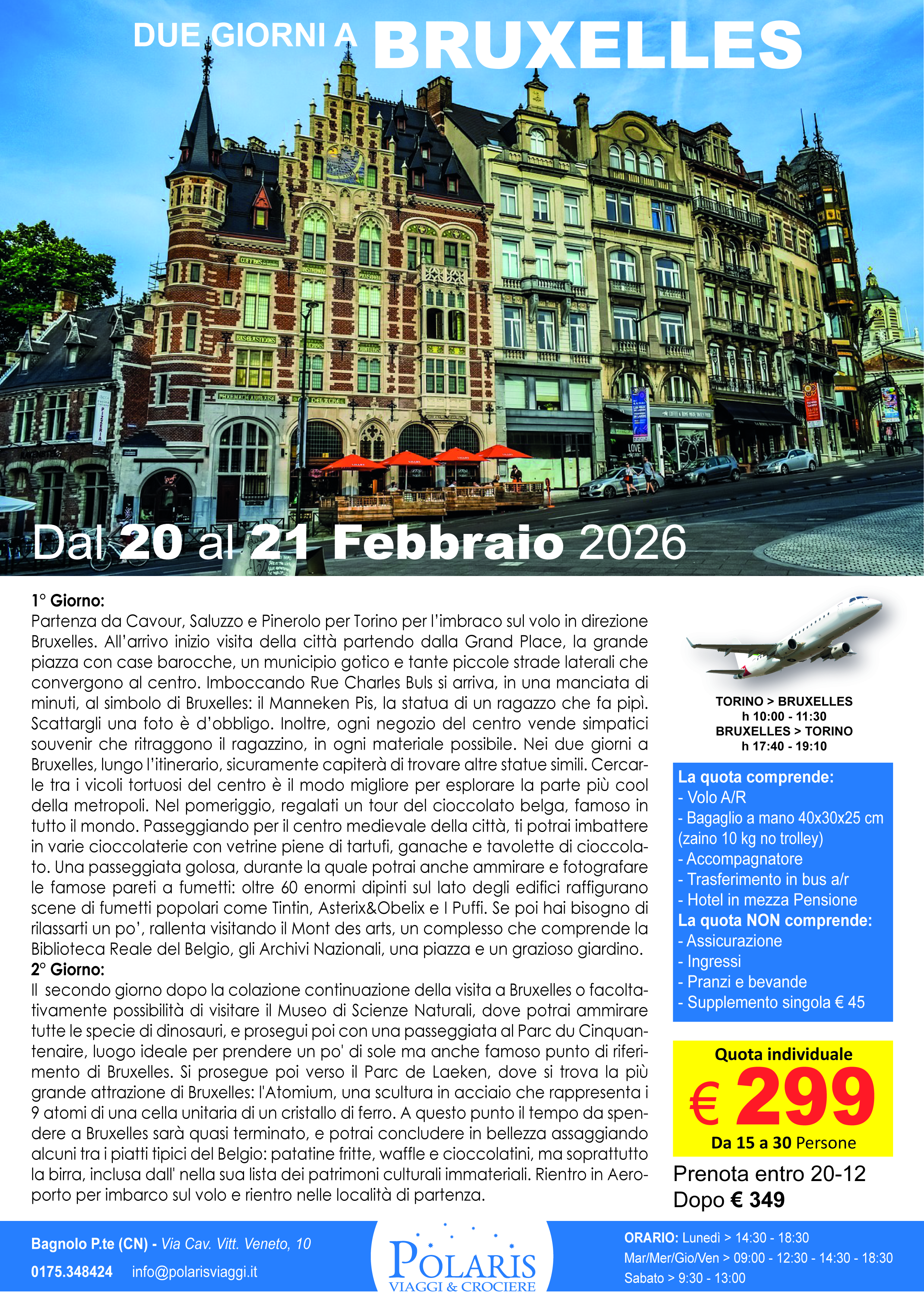 Partenza da Cavour, Saluzzo e Pinerolo per Torino per l’imbraco sul volo in direzione Bruxelles. All’arrivo inizio visita della città partendo dalla Grand Place, la grande piazza con case barocche, un municipio gotico e tante piccole strade laterali che convergono al centro. Imboccando Rue Charles Buls si arriva, in una manciata di minuti, al simbolo di Bruxelles: il Manneken Pis, la statua di un ragazzo che fa pipì. Scattargli una foto è d’obbligo. Inoltre, ogni negozio del centro vende simpatici souvenir che ritraggono il ragazzino, in ogni materiale possibile. Nei due giorni a Bruxelles, lungo l’itinerario, sicuramente capiterà di trovare altre statue simili. Cercarle tra i vicoli tortuosi del centro è il modo migliore per esplorare la parte più cool della metropoli. Nel pomeriggio, regalati un tour del cioccolato belga, famoso in tutto il mondo. Passeggiando per il centro medievale della città, ti potrai…