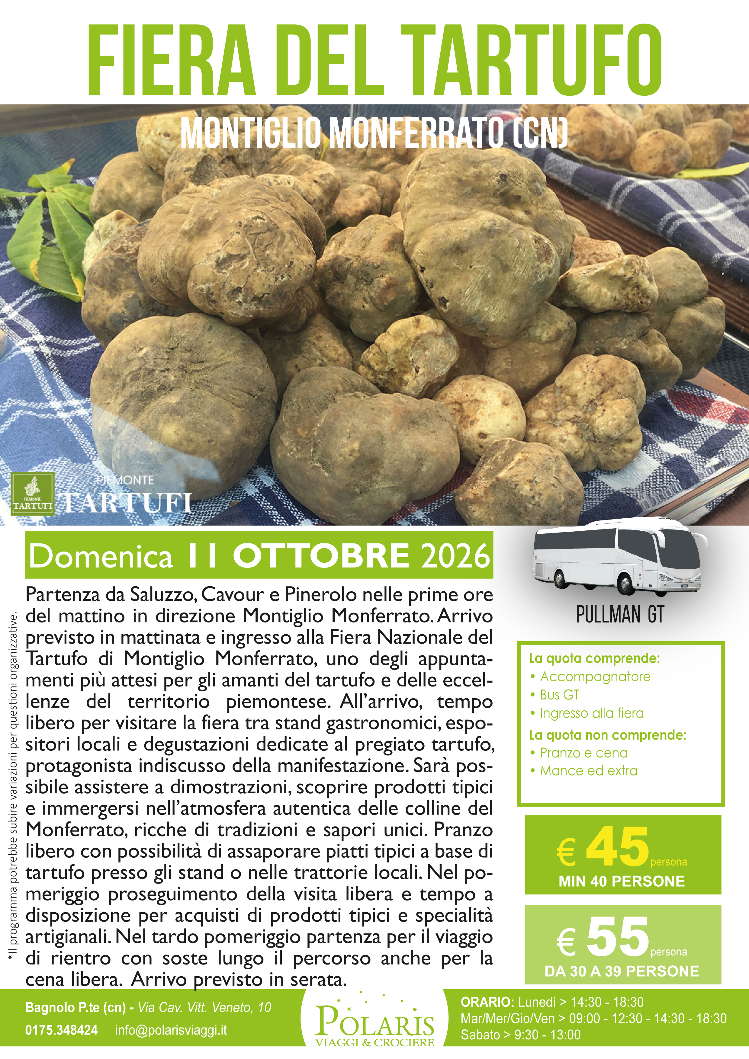 Partenza da Saluzzo, Cavour e Pinerolo nelle prime ore del mattino in direzione Montiglio Monferrato. Arrivo previsto in mattinata e ingresso alla Fiera Nazionale del Tartufo di Montiglio Monferrato, uno degli appuntamenti più attesi per gli amanti del tartufo e delle eccellenze del territorio piemontese. All’arrivo, tempo libero per visitare la fiera tra stand gastronomici, espositori locali e degustazioni dedicate al pregiato tartufo, protagonista indiscusso della manifestazione. Sarà possibile assistere a dimostrazioni, scoprire prodotti tipici e immergersi nell’atmosfera autentica delle colline del Monferrato, ricche di tradizioni e sapori unici. Pranzo libero con possibilità di assaporare piatti tipici a base di tartufo presso gli stand o nelle trattorie locali. Nel pomeriggio proseguimento della visita libera e tempo a disposizione per acquisti di prodotti tipici e specialità artigianali. Nel tardo pomeriggio partenza per il viaggio di rientro con soste lungo il percorso anche per la cena libera. Arriv…