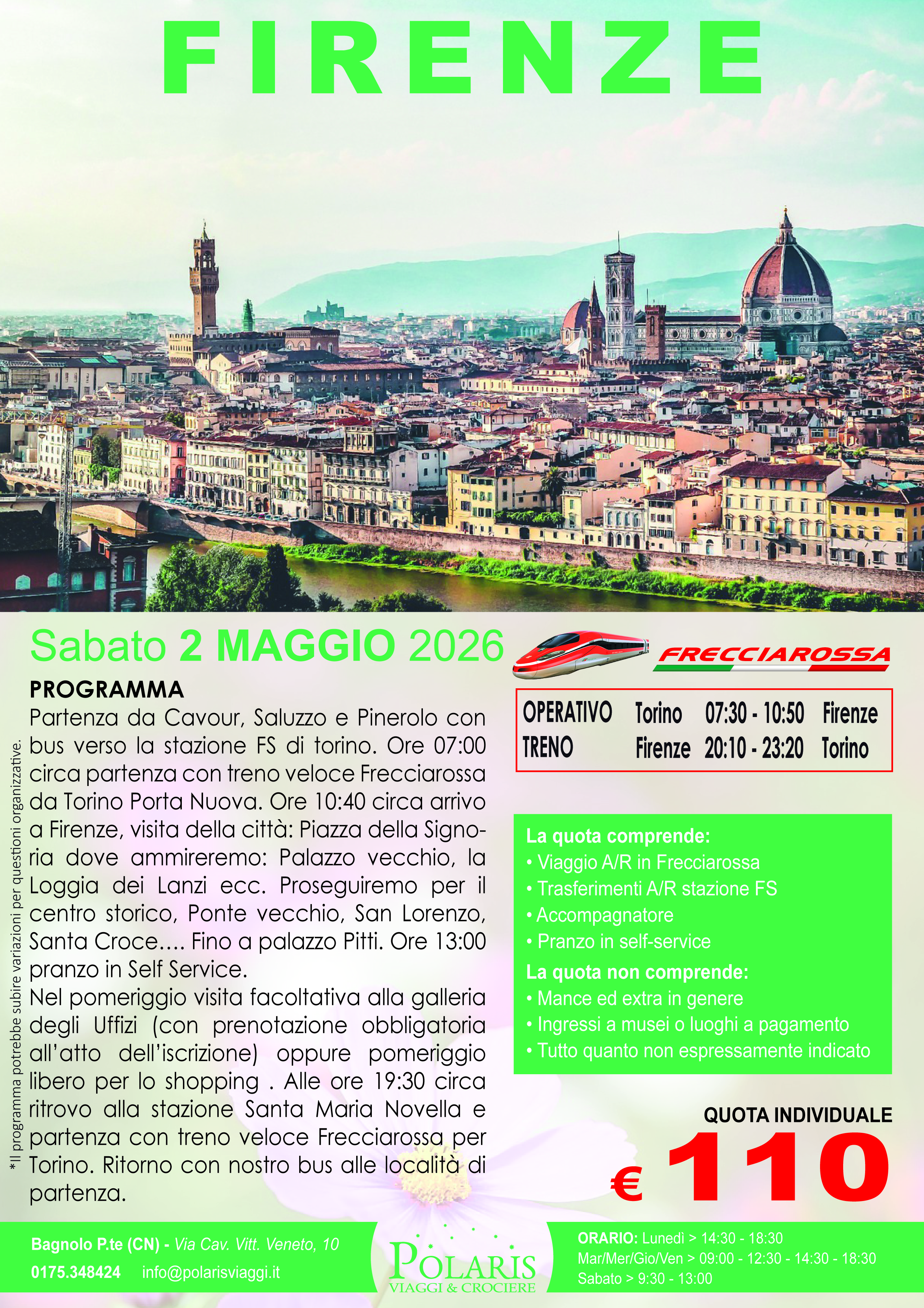 Partenza da Cavour, Saluzzo e Pinerolo con bus verso la stazione FS di torino. Ore 07:00 circa partenza con treno veloce Frecciarossa da Torino Porta Nuova. Ore 10:40 circa arrivo a Firenze, visita della città: Piazza della Signoria dove ammireremo: Palazzo vecchio, la Loggia dei Lanzi ecc. Proseguiremo per il centro storico, Ponte vecchio, San Lorenzo, Santa Croce…. Fino a palazzo Pitti. Ore 13:00 pranzo in Self Service.