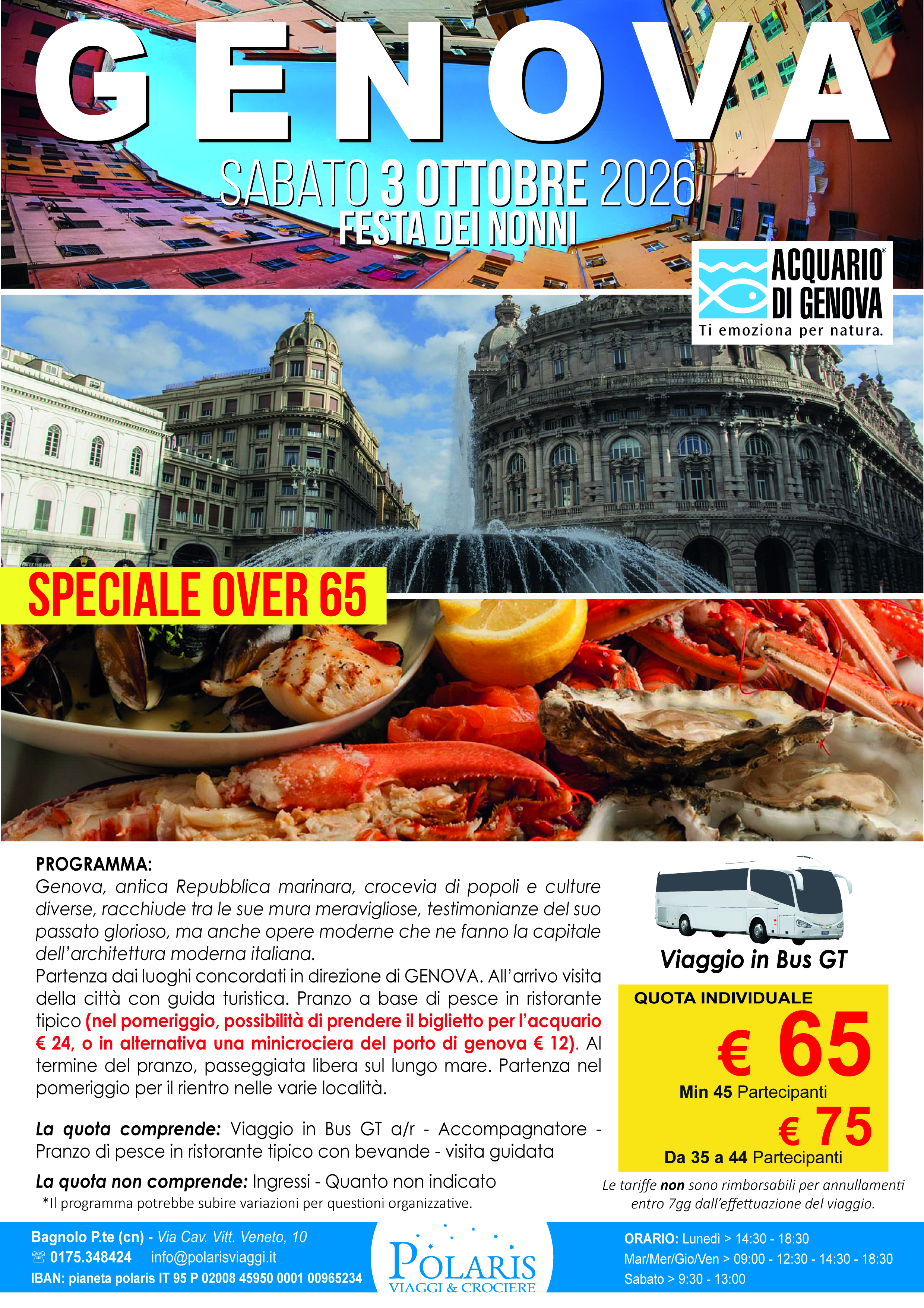 Partenza dai luoghi concordati in direzione di GENOVA. All’arrivo visita della città con guida turistica. Pranzo a base di pesce in ristorante tipico (nel pomeriggio, possibilità di prendere il biglietto per l’acquario € 24, o in alternativa una minicrociera del porto di genova € 12). Al termine del pranzo, passeggiata libera sul lungo mare. Partenza nel pomeriggio per il rientro nelle varie località.