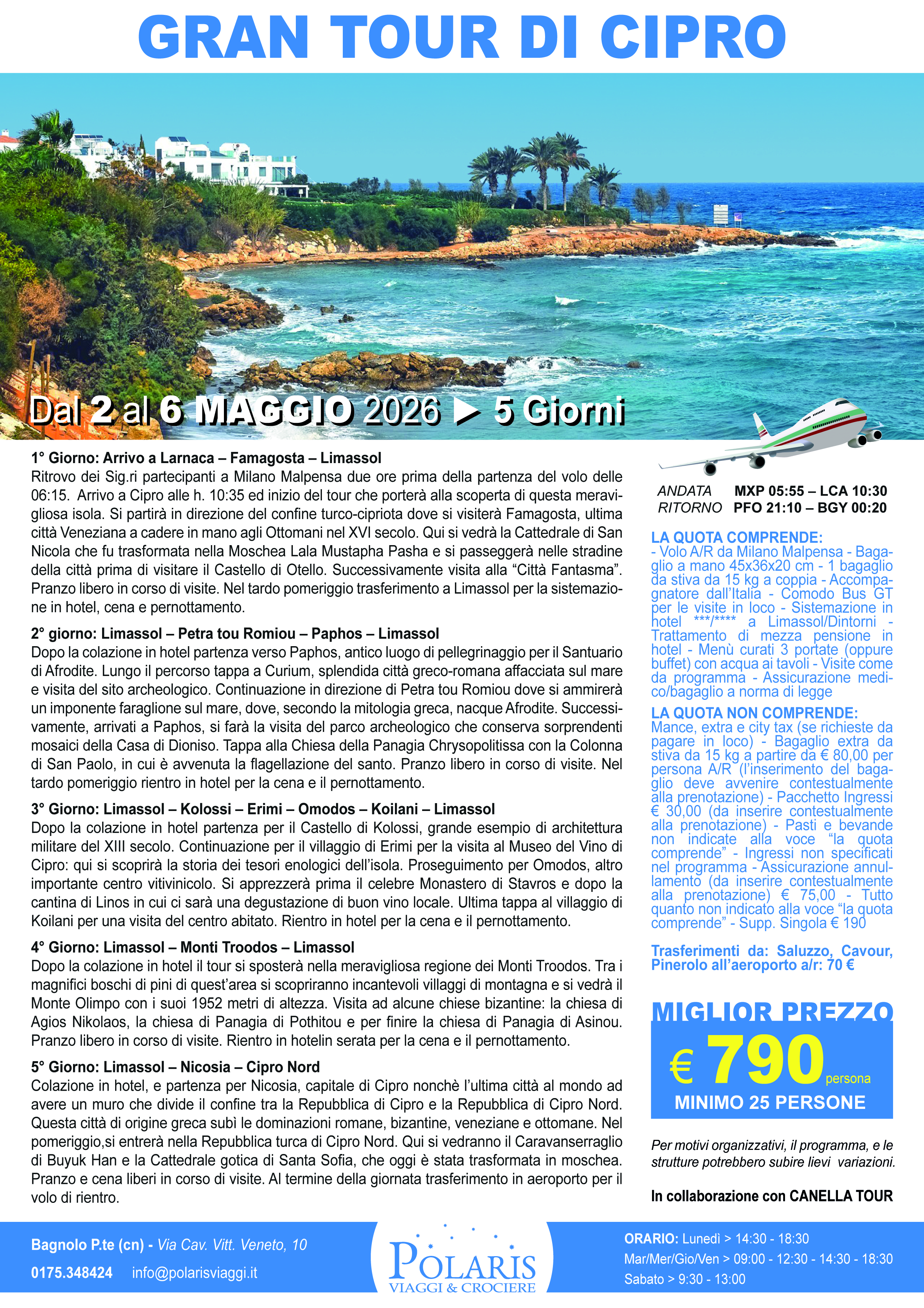Ritrovo dei Sig.ri partecipanti a Milano Malpensa due ore prima della partenza del volo delle 06:15. Arrivo a Cipro alle h. 10:45 ed inizio del Gran tour che porterà alla scoperta di questa meravigliosa isola. Si partirà in direzione del confine turco-cipriota dove si visiterà Famagosta, ultima città Veneziana a cadere in mano agli Ottomani nel XVI secolo. Qui si vedrà la Cattedrale di San Nicola che fu trasformata nella Moschea Lala Mustapha Pasha e si passeggerà nelle stradine della città prima di visitare il Castello di Otello. Successivamente visita alla “Città Fantasma”, suggestiva parte di Famagosta dove tutto sembra essersi fermato al 1974 quando la città fu invasa e occupata dall’esercito turco e provocando una fuga di massa degli abitanti greco- ciprioti che abbandonarono la città. Pranzo libero in corso di visite. Nel tardo pomeriggio trasferimento…
