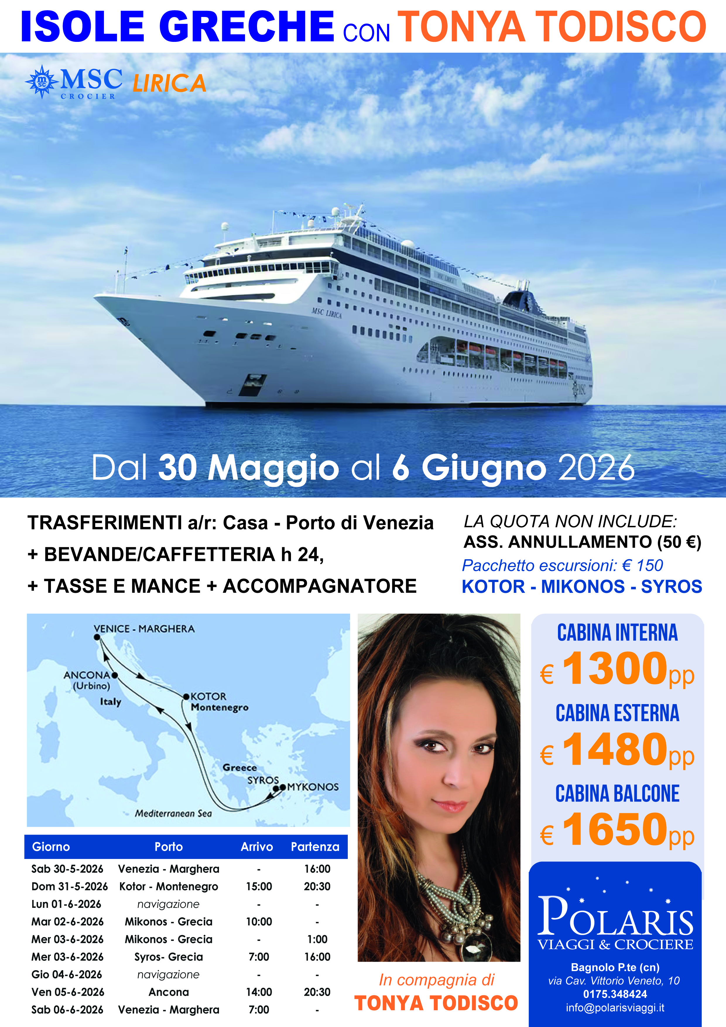 PREZZO PER PERSONA: Cab Interna € 1300 Cab Esterna € 1480 Cab Balcone € 1650
