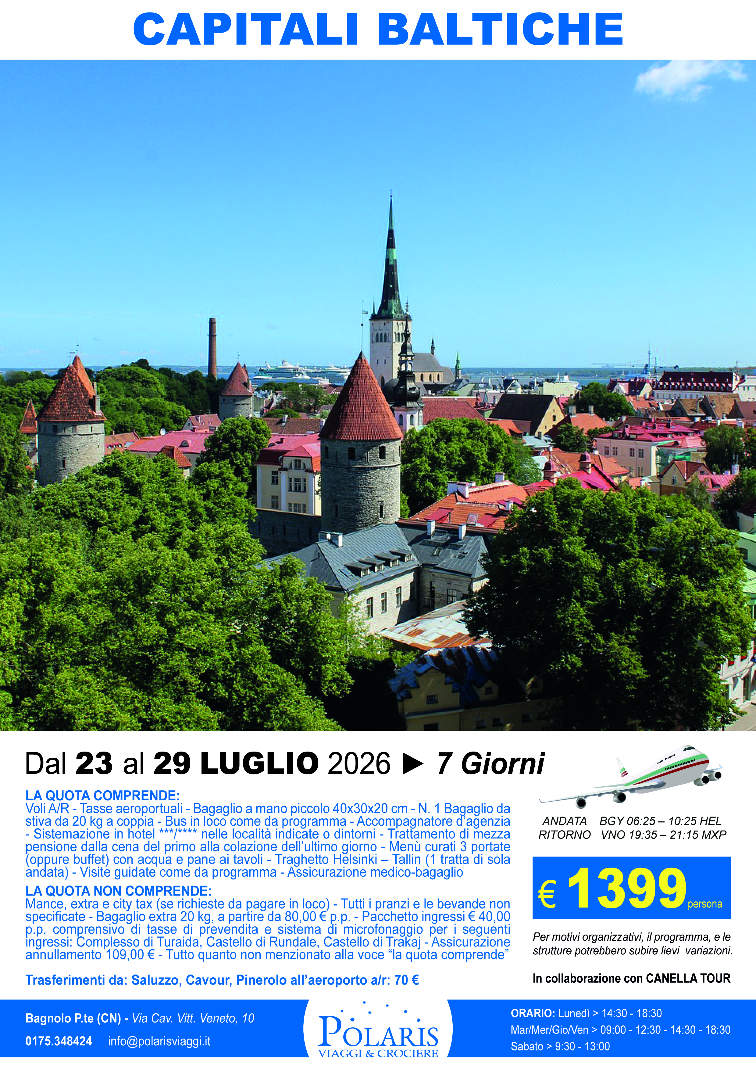 Ritrovo dei signori partecipanti con nostro accompagnatore presso l’aeroporto di Milano Bergamo due ore prima della partenza del viaggio. All’arrivo operazioni di imbarco e partenza con volo delle h. 06:20 con arrivo a Helsinki alle 10:25. Incontro con il bus e la guida locale ed inizio della visita della capitale finlandese, il cui territorio è per il 30 per cento destinato ad area verde ed è impreziosito da opere architettoniche significative, tra le quali quelle del grande architetto Alvar Aalto. La nostra visita guidata tocca lo Stadio Olimpico, il monumento al compositore Sibelius, la piazza del Senato a forma rettangolare circondata da edifici neoclassici, la Cattedrale di S. Nicola, via Mannerhein, il Parlamento e la Chiesa Ortodossa. Pranzo libero. Nel pomeriggio dopo un po’ di tempo libero a disposizione imbarco sul traghetto in direzione Tallin. Arrivo nel tardo pomeriggio…