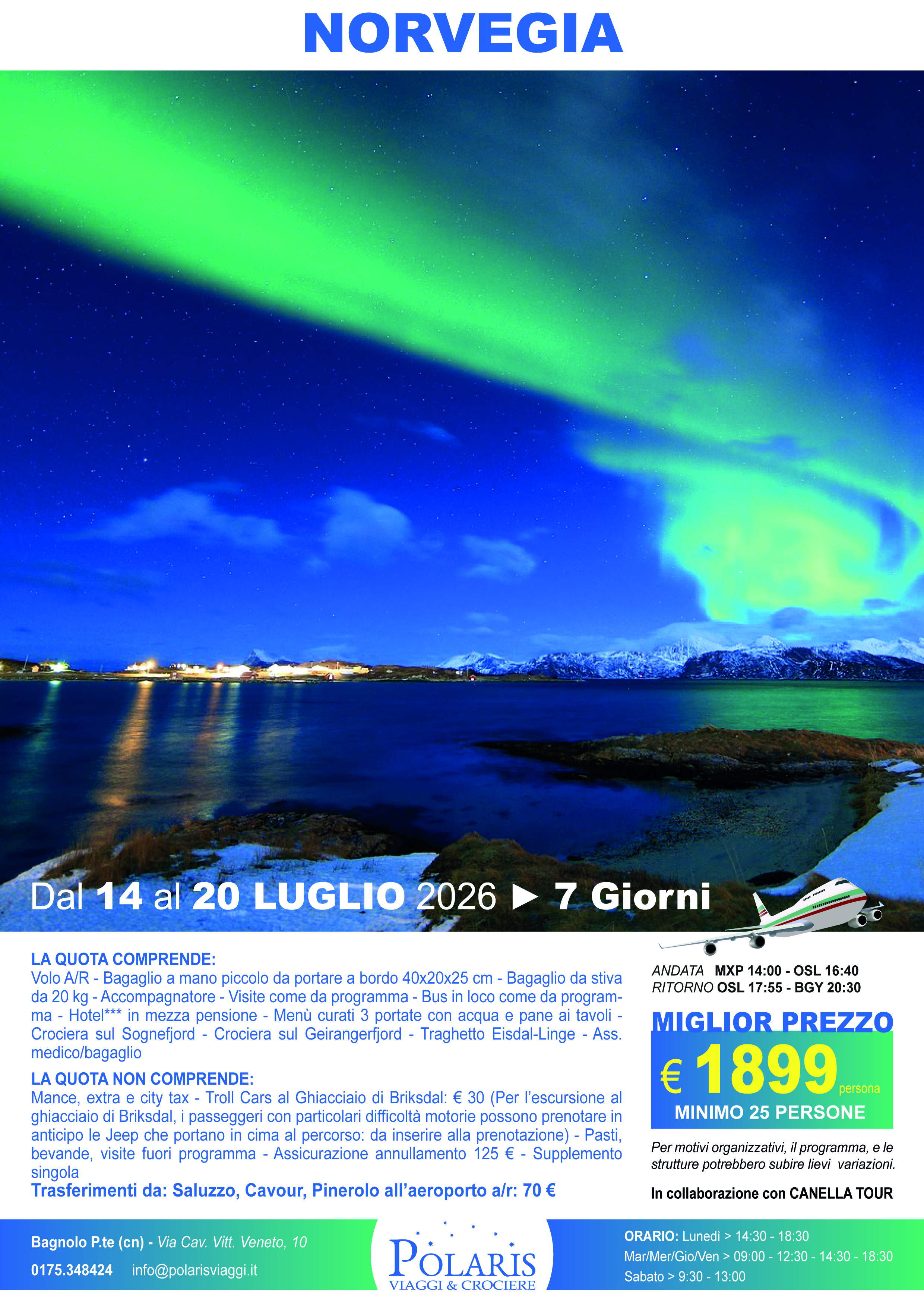 Il prezzo del biglietto è valido a titolo di acconto. Il saldo del viaggio può essere effettuato direttamente in agenzia o tramite Bonifico (IBAN: IT95P0200845950000100965234 - destinatario: PIANETA POLARIS DI BRUNO ALDO - causale: NOME E COGNOME + VIAGGIO + DATA VIAGGIO).