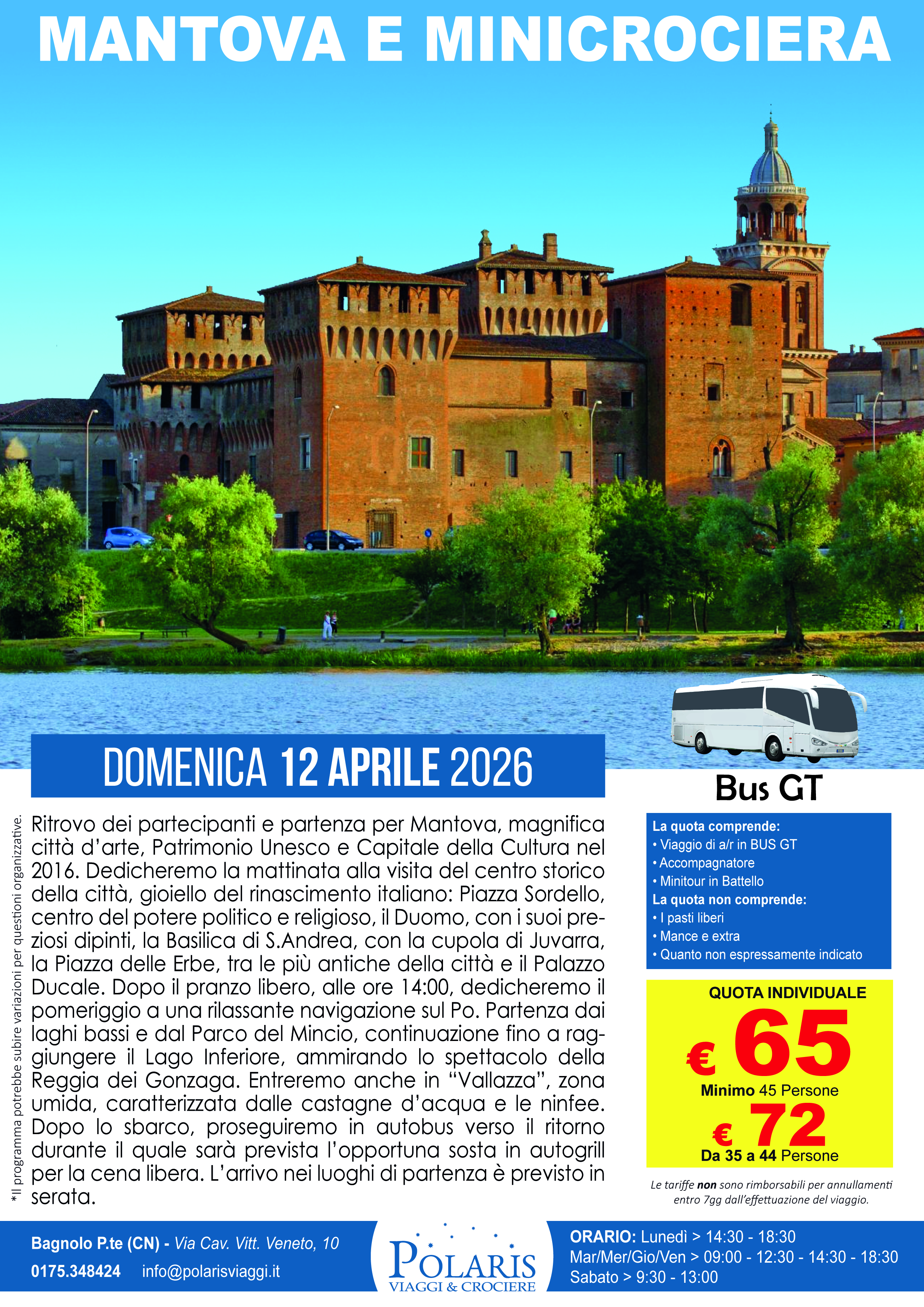 Ritrovo dei partecipanti e partenza per Mantova, magnifica città d’arte, Patrimonio Unesco e Capitale della Cultura nel 2016. Dedicheremo la mattinata alla visita del centro storico della città, gioiello del rinascimento italiano: Piazza Sordello, centro del potere politico e religioso, il Duomo, con i suoi preziosi dipinti, la Basilica di S. Andrea, con la cupola di Juvarra, la Piazza delle Erbe, tra le più antiche della città e il Palazzo Ducale. Dopo il pranzo libero, alle ore 14:00, dedicheremo il pomeriggio a una rilassante navigazione sul Po. Partenza dai laghi bassi e dal Parco del Mincio, continuazione fino a raggiungere il Lago Inferiore, ammirando lo spettacolo della Reggia dei Gonzaga. Entreremo anche in “Vallazza”, zona umida, caratterizzata dalle castagne d’acqua e le ninfee. Dopo lo sbarco, proseguiremo in autobus verso il ritorno durante il quale sarà prevista l’opportuna sosta in autogrill per la cena libera. L’arriv…