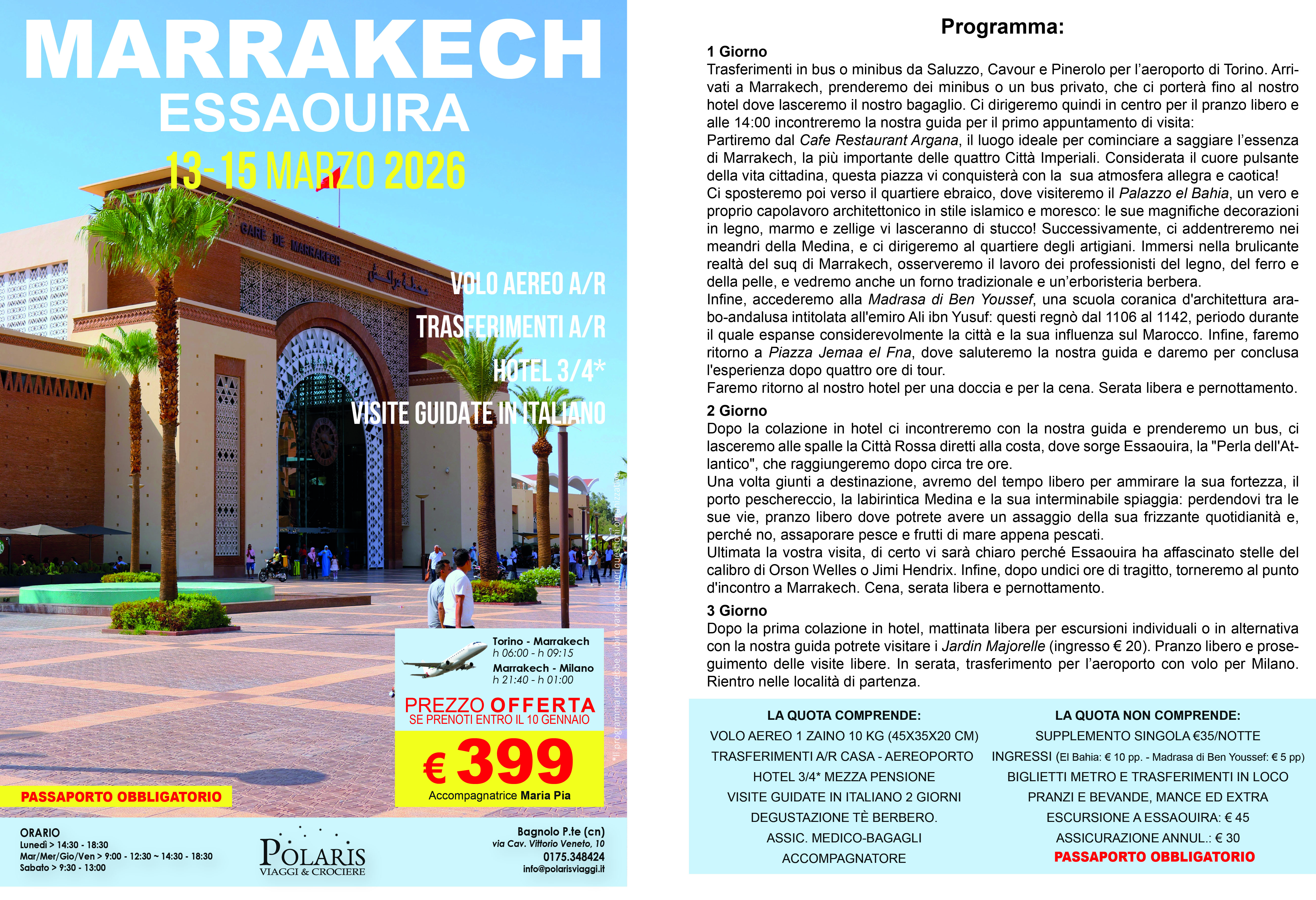 Trasferimenti in bus o minibus da Saluzzo, Cavour e Pinerolo per l’aeroporto di Torino. Arrivati a Marrakech, prenderemo dei minibus o un bus privato, che ci porterà fino al nostro hotel dove lasceremo il nostro bagaglio. Ci dirigeremo quindi in centro per il pranzo libero e alle 14:00 incontreremo la nostra guida per il primo appuntamento di visita:
