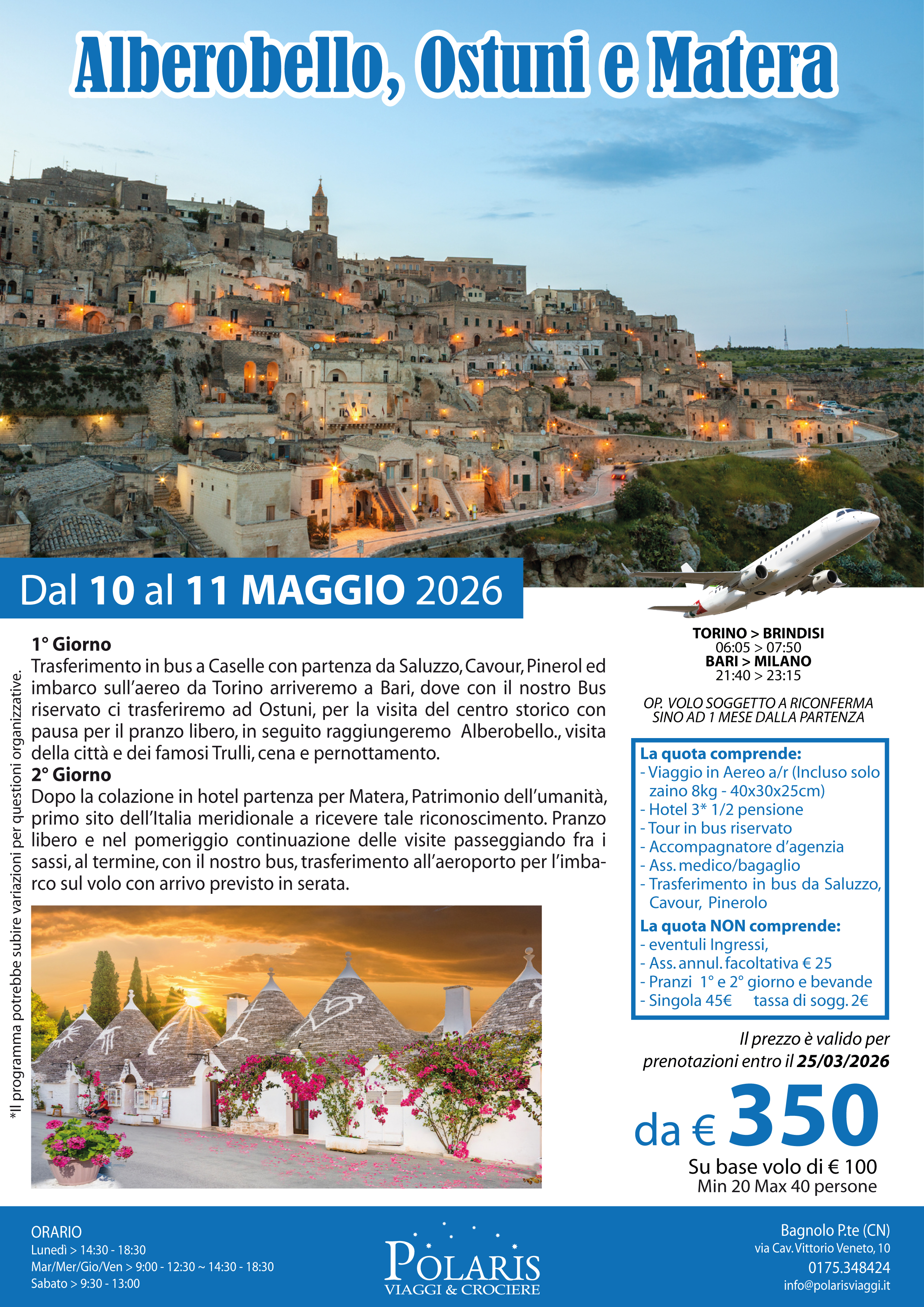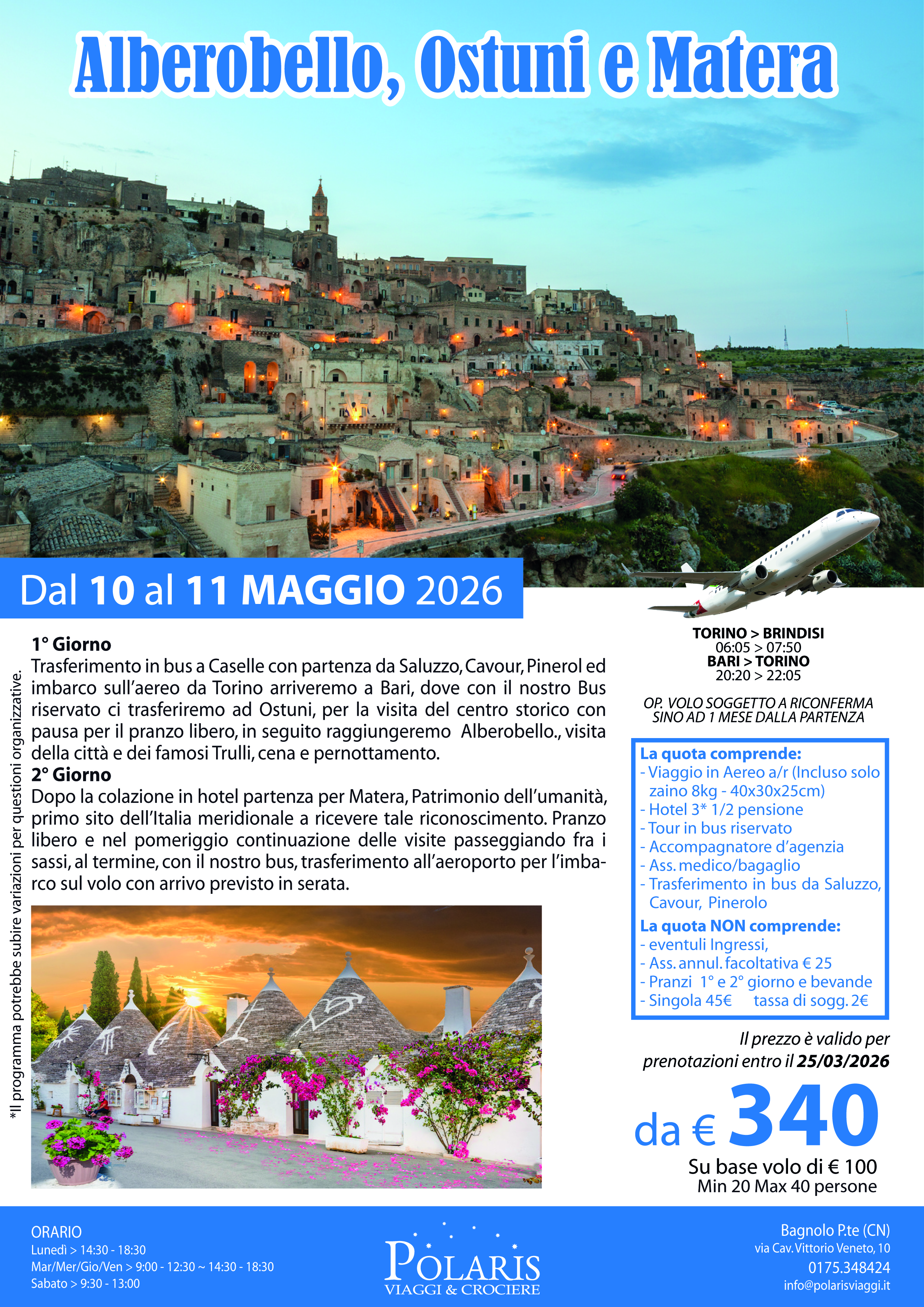 Trasferimento in bus a Caselle con partenza da Saluzzo, Cavour, Pinerol ed imbarco sull’aereo da Torino arriveremo a Bari, dove con il nostro Bus riservato ci trasferiremo ad Ostuni, per la visita del centro storico con pausa per il pranzo libero, in seguito raggiungeremo Alberobello., visita della città e dei famosi Trulli, cena e pernottamento.