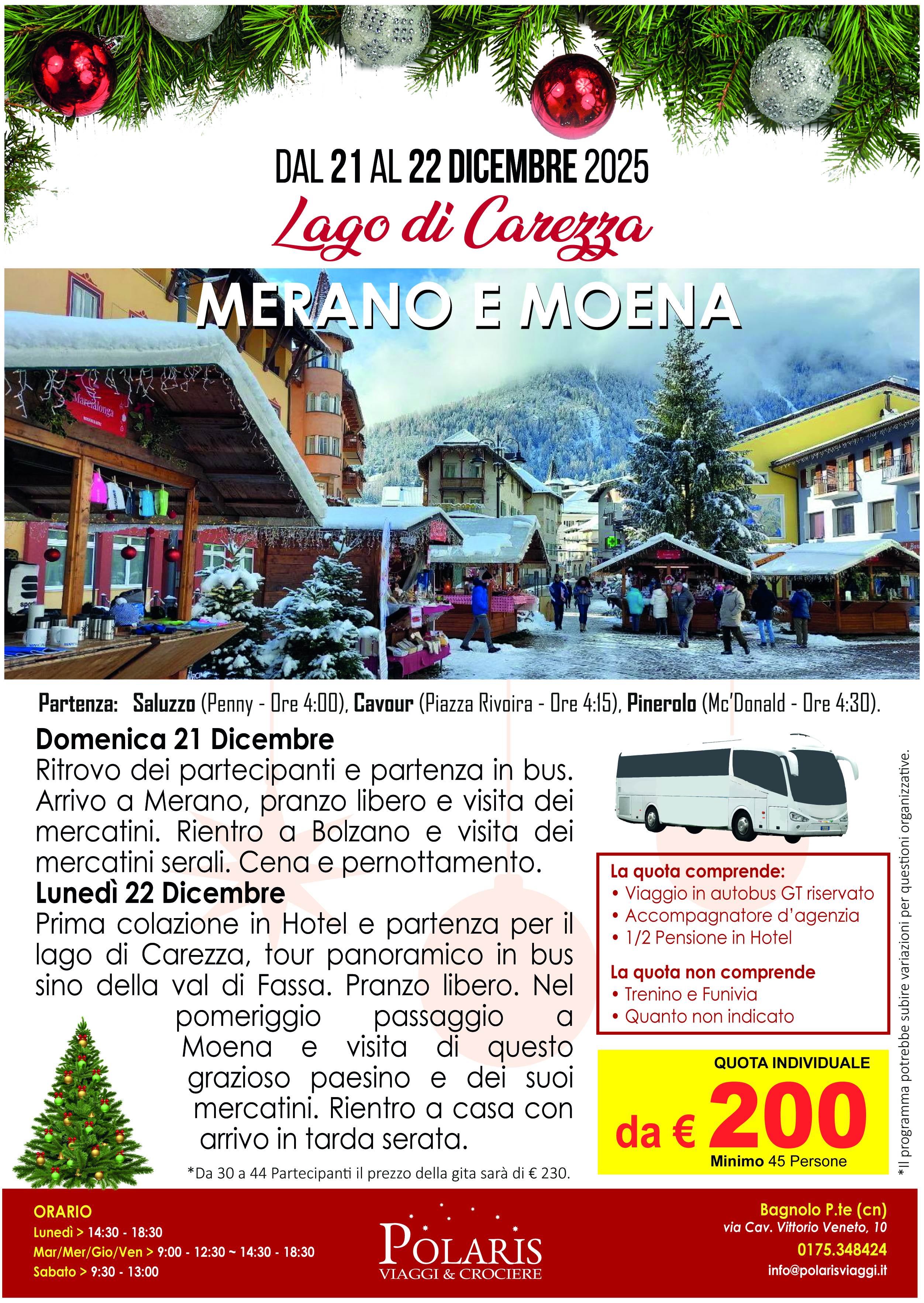 Prima colazione in Hotel e partenza per il lago di Carezza, tour panoramico in bus sino della val di Fassa. Pranzo libero. Nel pomeriggio passaggio a Moena e visita di questo grazioso paesino e dei suoi mercatini. Rientro a casa con arrivo in tarda serata.