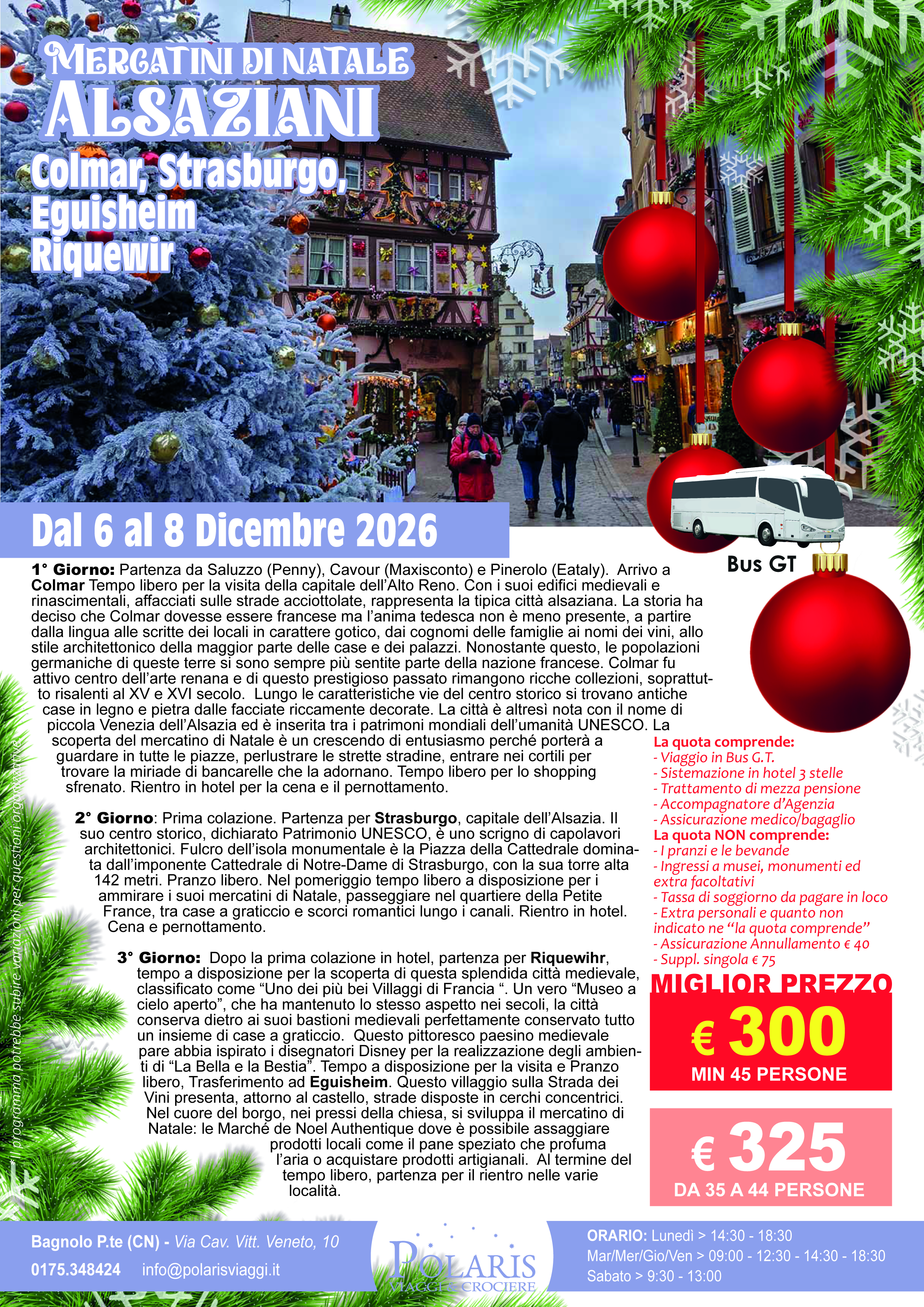 1° Giorno: Partenza da Saluzzo (Penny), Cavour (Maxisconto) e Pinerolo (Eataly). Arrivo a Colmar Tempo libero per la visita della capitale dell’Alto Reno. Con i suoi edifici medievali e rinascimentali, affacciati sulle strade acciottolate, rappresenta la tipica città alsaziana. La storia ha deciso che Colmar dovesse essere francese ma l’anima tedesca non è meno presente, a partire dalla lingua alle scritte dei locali in carattere gotico, dai cognomi delle famiglie ai nomi dei vini, allo stile architettonico della maggior parte delle case e dei palazzi. Nonostante questo, le popolazioni germaniche di queste terre si sono sempre più sentite parte della nazione francese. Colmar fu attivo centro dell’arte renana e di questo prestigioso passato rimangono ricche collezioni, soprattutto risalenti al XV e XVI secolo. Lungo le caratteristiche vie del centro storico si trovano antiche case in legno e pietra dalle facciate riccamente decorate. La città è altre…