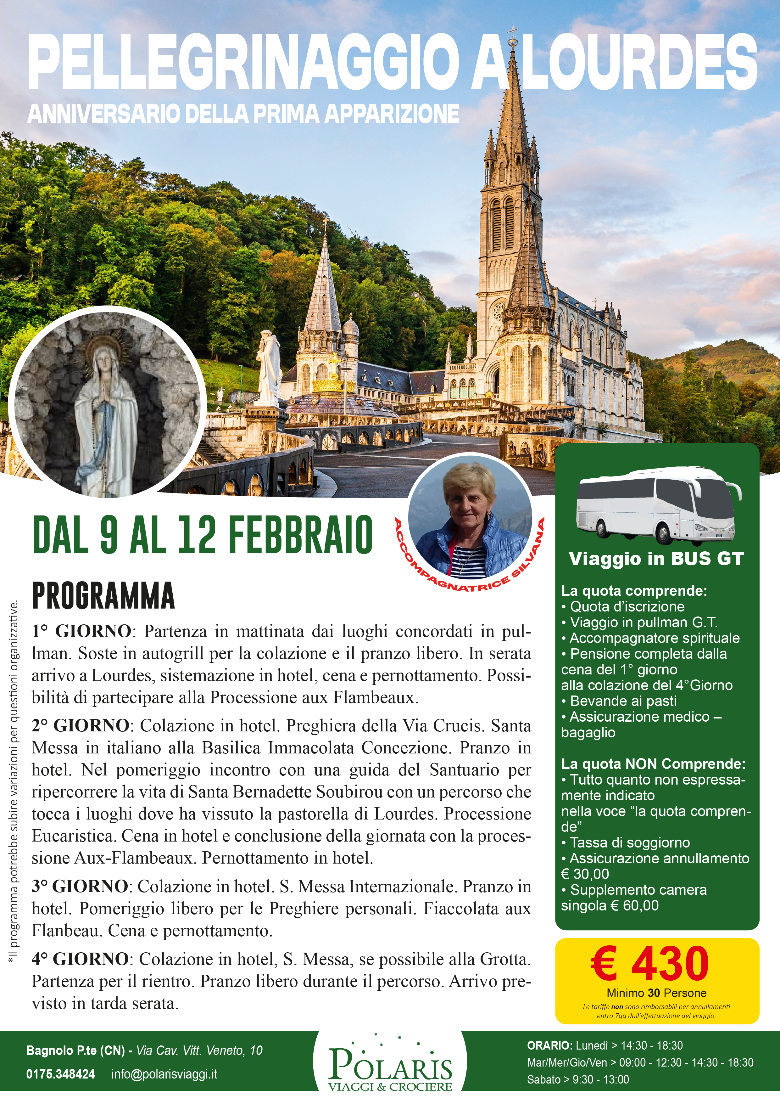 1° GIORNO: Partenza in mattinata dai luoghi concordati in pul lman. Soste in autogrill per la colazione e il pranzo libero. In serata arrivo a Lourdes, sistemazione in hotel, cena e pernottamento. Possi bilità di partecipare alla Processione aux Flambeaux