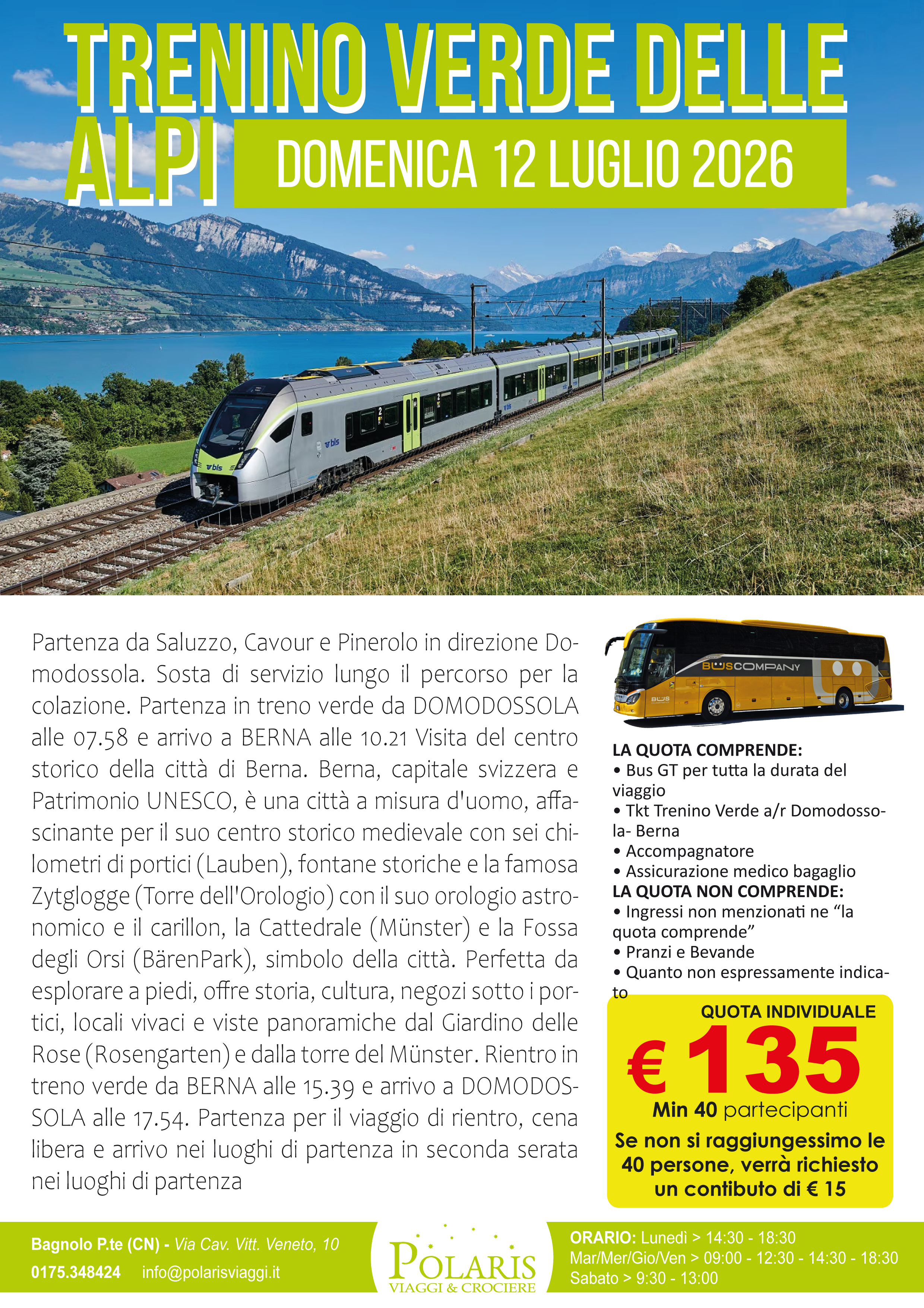 Partenza da Saluzzo, Cavour e Pinerolo in direzione Domodossola. Sosta di servizio lungo il percorso per la colazione. Partenza in treno verde da DOMODOSSOLA alle 07.58 e arrivo a BERNA alle 10.21 Visita del centro storico della città di Berna. Berna, capitale svizzera e Patrimonio UNESCO, è una città a misura d'uomo, affascinante per il suo centro storico medievale con sei chilometri di portici (Lauben), fontane storiche e la famosa Zytglogge (Torre dell'Orologio) con il suo orologio astronomico e il carillon, la Cattedrale (Münster) e la Fossa degli Orsi (BärenPark), simbolo della città. Perfetta da esplorare a piedi, offre storia, cultura, negozi sotto i portici, locali vivaci e viste panoramiche dal Giardino delle Rose (Rosengarten) e dalla torre del Münster. Rientro in treno verde da BERNA alle 15.39 e arrivo a DOMODOSSOLA alle 17.54. Partenza per il viaggio di rientro, cena libera e arrivo nei luoghi…