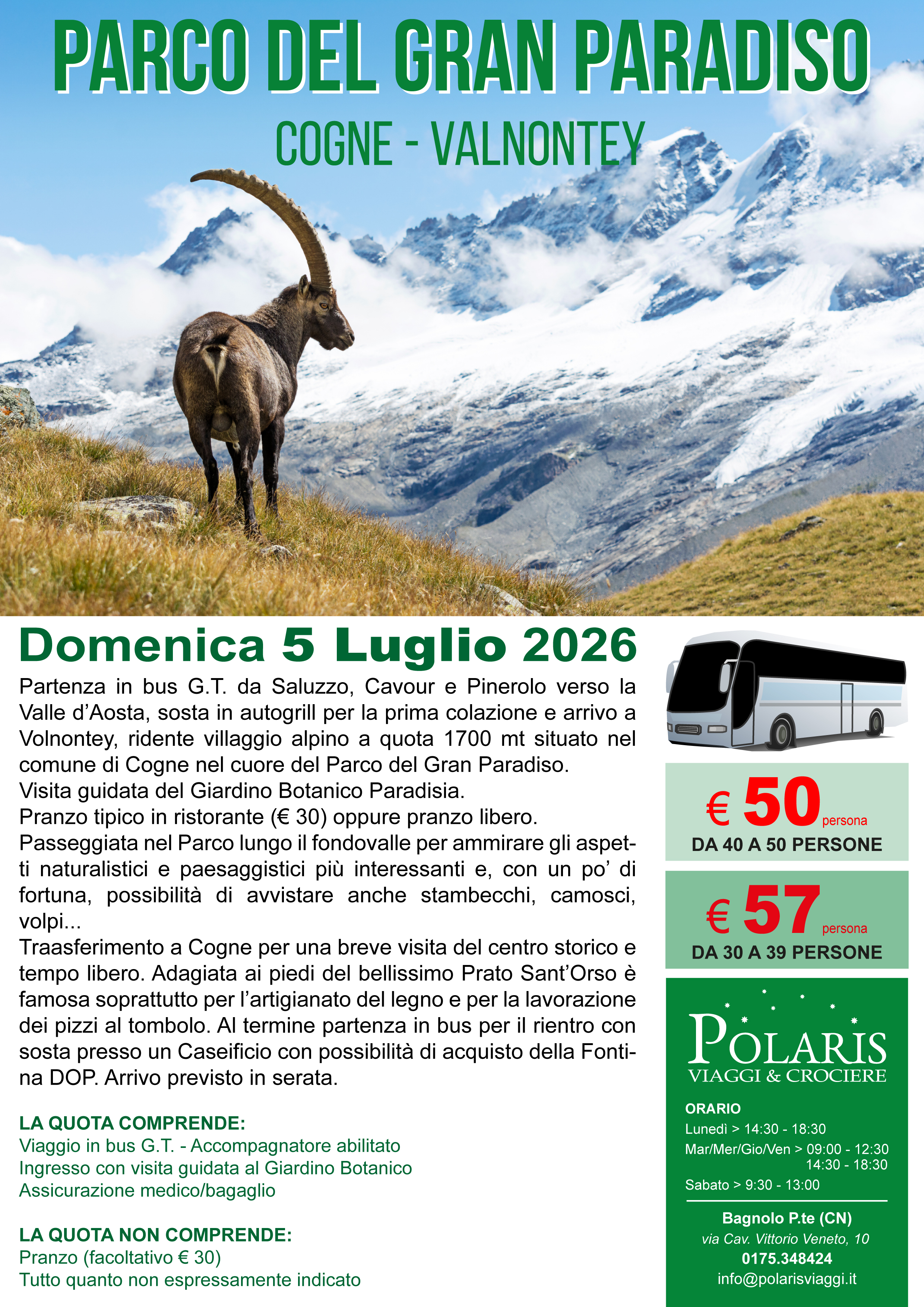 Partenza in bus G.T. da Saluzzo, Cavour e Pinerolo verso la Valle d’Aosta, sosta in autogrill per la prima colazione e arrivo a Volnontey, ridente villaggio alpino a quota 1700 mt situato nel comune di Cogne nel cuore del Parco del Gran Paradiso.
