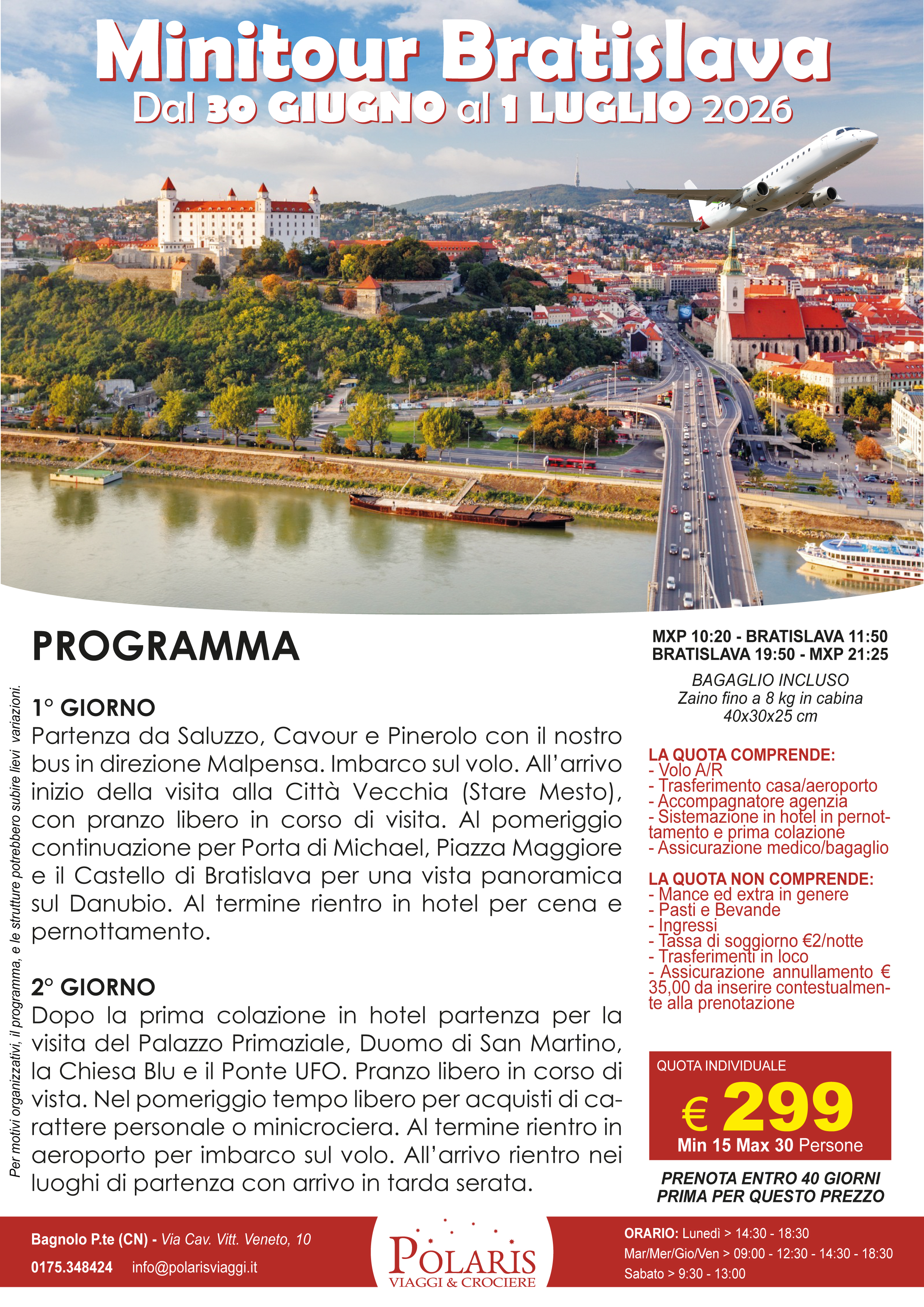 Partenza da Saluzzo, Cavour e Pinerolo con il nostro bus in direzione Malpensa. Imbarco sul volo. All’arrivo inizio della visita alla Città Vecchia (Stare Mesto), con pranzo libero in corso di visita. Al pomeriggio continuazione per Porta di Michael, Piazza Maggiore e il Castello di Bratislava per una vista panoramica sul Danubio. Al termine rientro in hotel per cena e pernottamento.