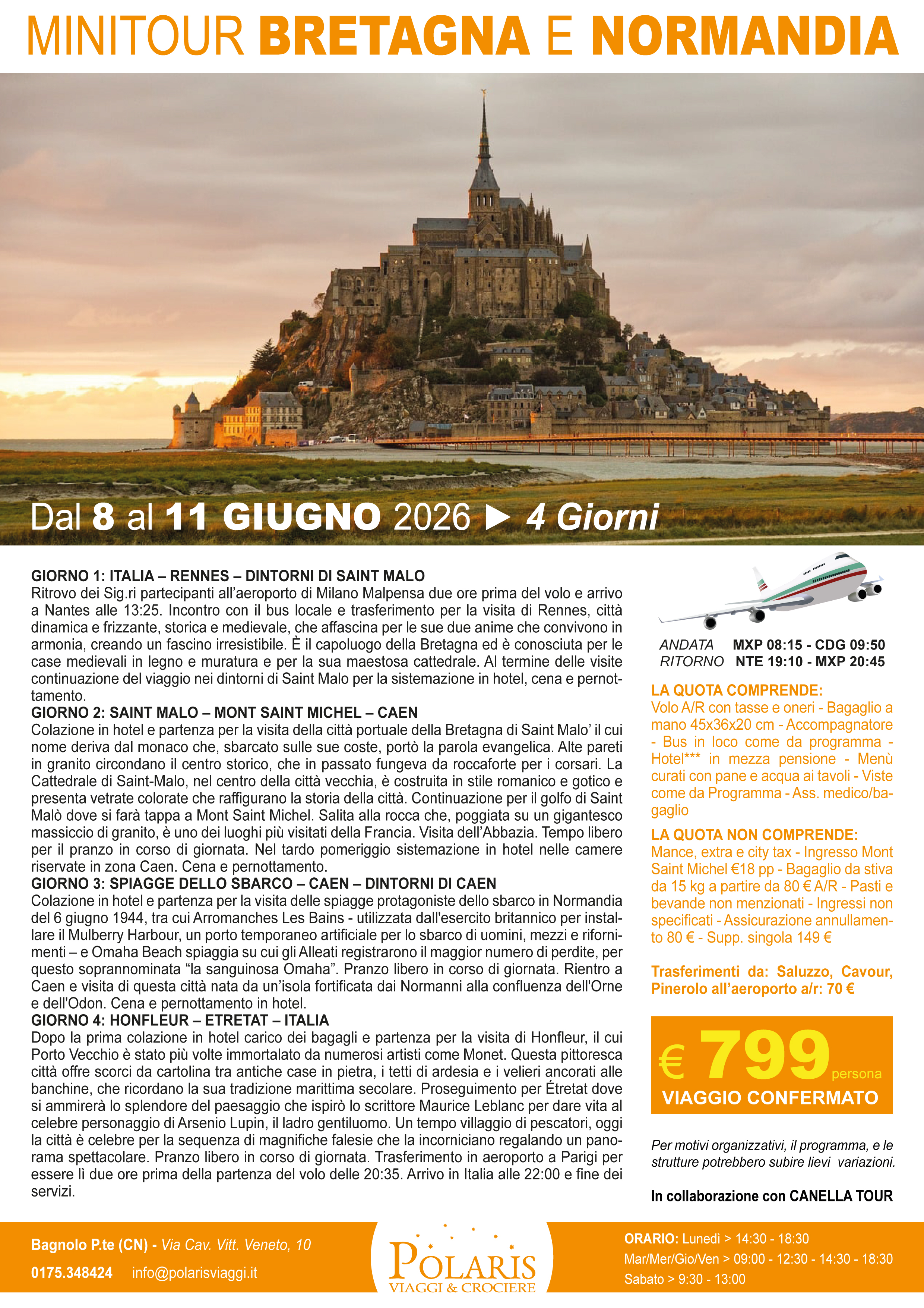 Colazione in hotel e partenza per la visita della città portuale della Bretagna di Saint Malo’ il cui nome deriva dal monaco che, sbarcato sulle sue coste, portò la parola evangelica.…