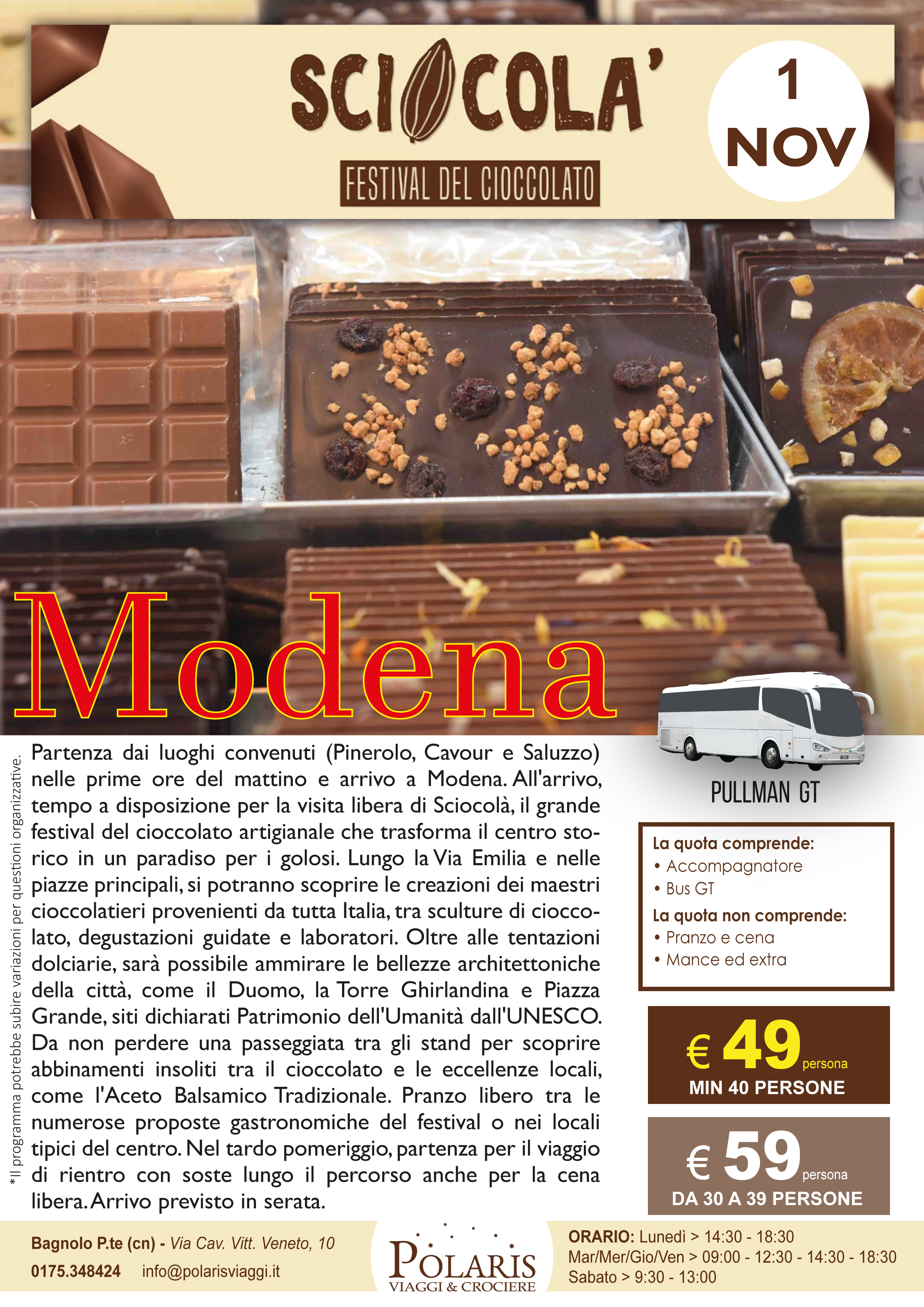 Partenza dai luoghi convenuti (Pinerolo, Cavour e Saluzzo) nelle prime ore del mattino e arrivo a Modena. All'arrivo, tempo a disposizione per la visita libera di Sciocolà, il grande festival del cioccolato artigianale che trasforma il centro storico in un paradiso per i golosi. Lungo la Via Emilia e nelle piazze principali, si potranno scoprire le creazioni dei maestri cioccolatieri provenienti da tutta Italia, tra sculture di cioccolato, degustazioni guidate e laboratori. Oltre alle tentazioni dolciarie, sarà possibile ammirare le bellezze architettoniche della città, come il Duomo, la Torre Ghirlandina e Piazza Grande, siti dichiarati Patrimonio dell'Umanità dall'UNESCO. Da non perdere una passeggiata tra gli stand per scoprire abbinamenti insoliti tra il cioccolato e le eccellenze locali, come l'Aceto Balsamico Tradizionale. Pranzo libero tra le numerose proposte gastronomiche del festival o nei locali tipici del centro. Nel tardo pomeriggio, partenza per il viaggio di rientro con…