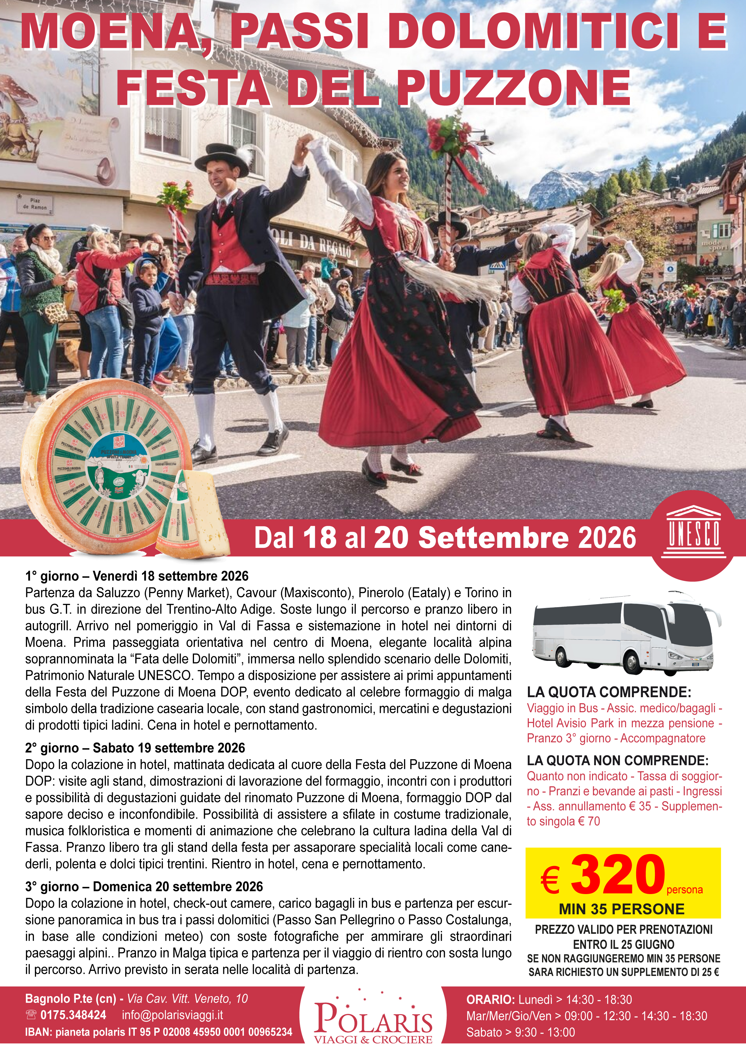 Partenza da Saluzzo (Penny Market), Cavour (Maxisconto), Pinerolo (Eataly) e Torino in bus G.T. in direzione del Trentino-Alto Adige. Soste lungo il percorso e pranzo libero in autogrill. Arrivo nel pomeriggio in Val di Fassa e sistemazione in hotel nei dintorni di Moena. Prima passeggiata orientativa nel centro di Moena, elegante località alpina soprannominata la “Fata delle Dolomiti”, immersa nello splendido scenario delle Dolomiti, Patrimonio Naturale UNESCO. Tempo a disposizione per assistere ai primi appuntamenti della Festa del Puzzone di Moena DOP, evento dedicato al celebre formaggio di malga simbolo della tradizione casearia locale, con stand gastronomici, mercatini e degustazioni di prodotti tipici ladini. Cena in hotel e pernottamento.