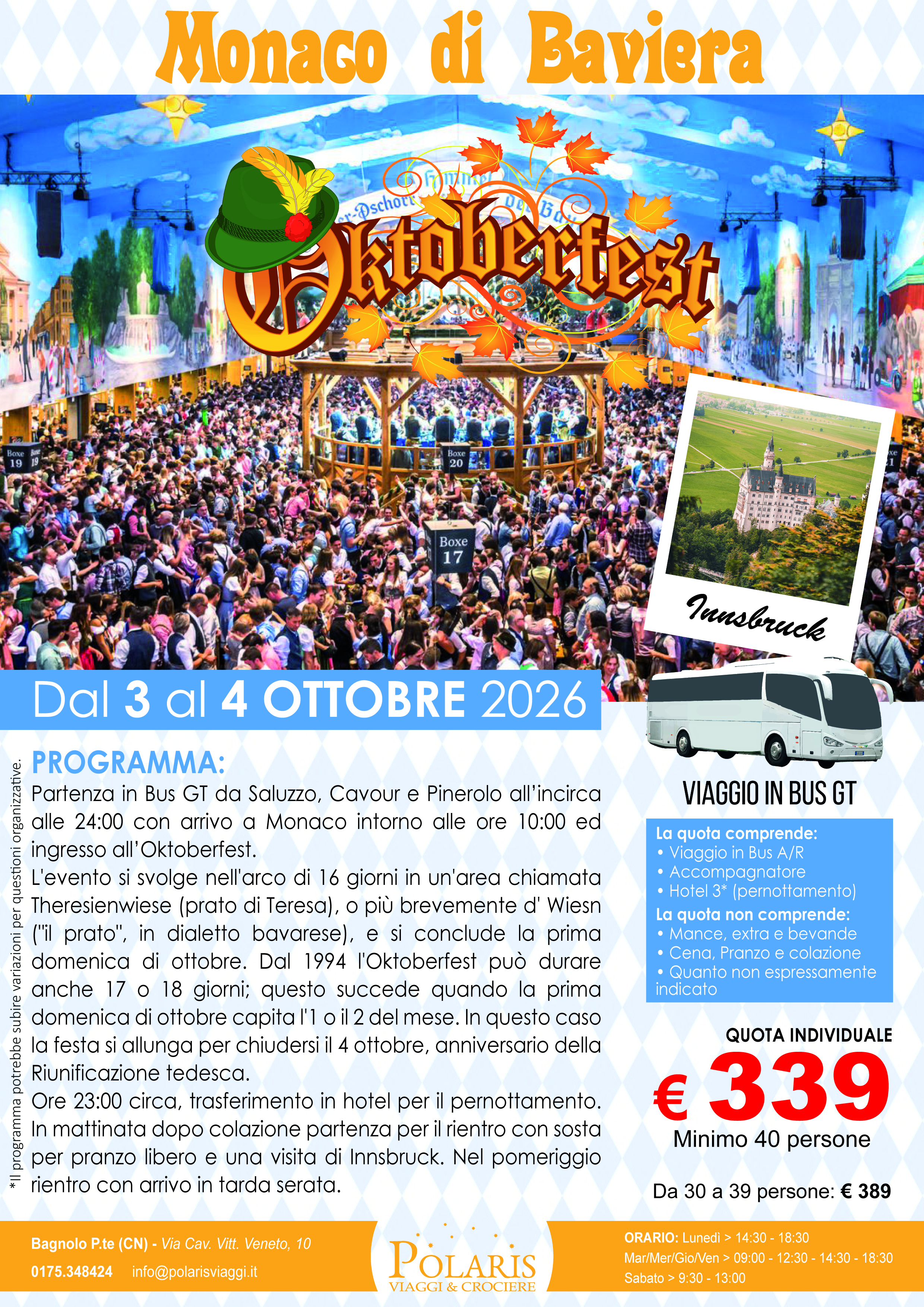 Partenza in Bus GT da Saluzzo, Cavour e Pinerolo all’incirca alle 24:00 con arrivo a Monaco intorno alle ore 10:00 ed ingresso all’Oktoberfest.