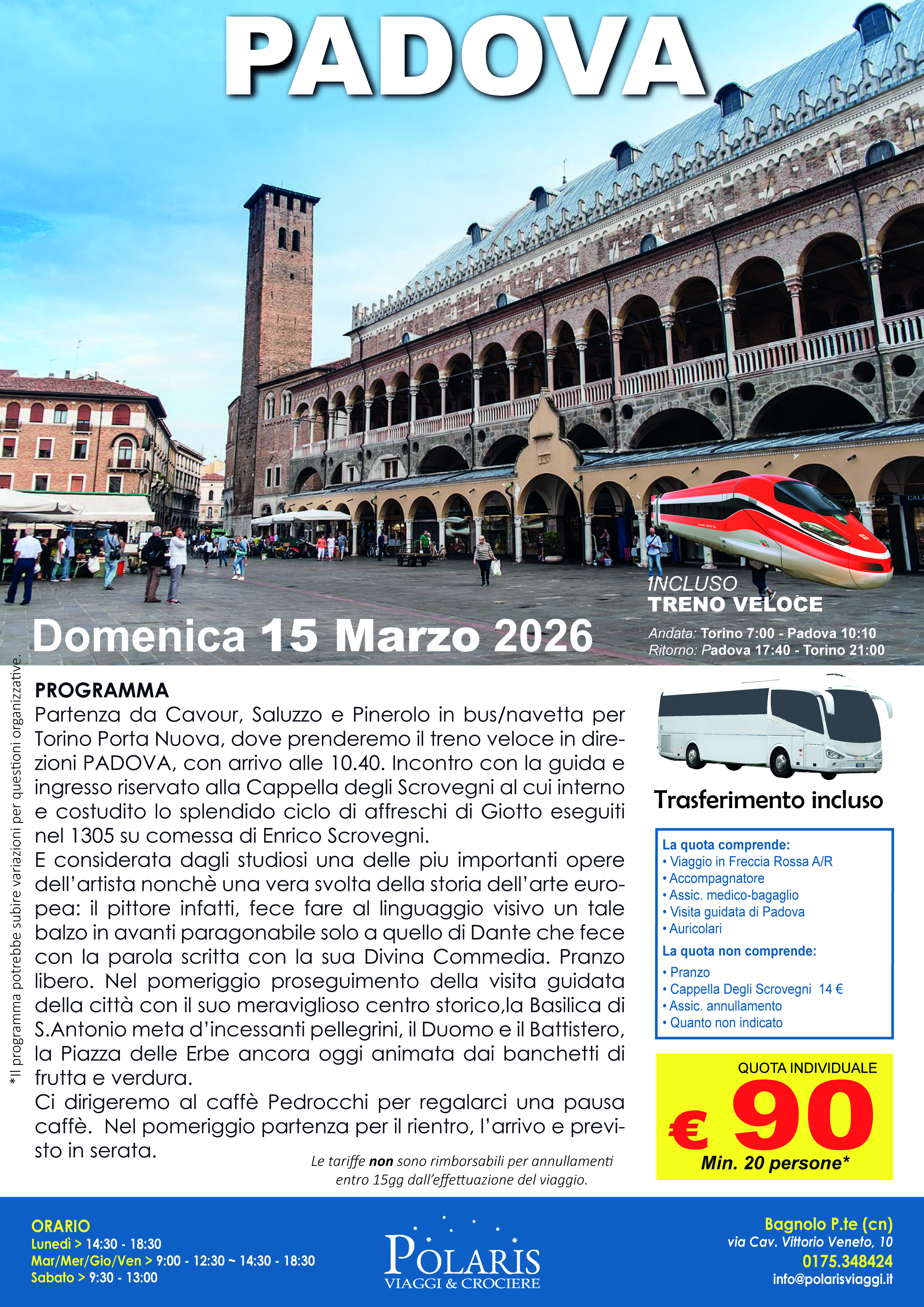 Partenza da Cavour, Saluzzo e Pinerolo in bus/navetta per Torino Porta Nuova, dove prenderemo il Freccia Rossa per PADOVA, con arrivo alle 10.40. Incontro con la guida e ingresso riservato alla Cappella degli Scrovegni al cui interno e costudito lo splendido ciclo di affreschi di Giotto eseguiti nel 1305 su comessa di Enrico Scrovegni.