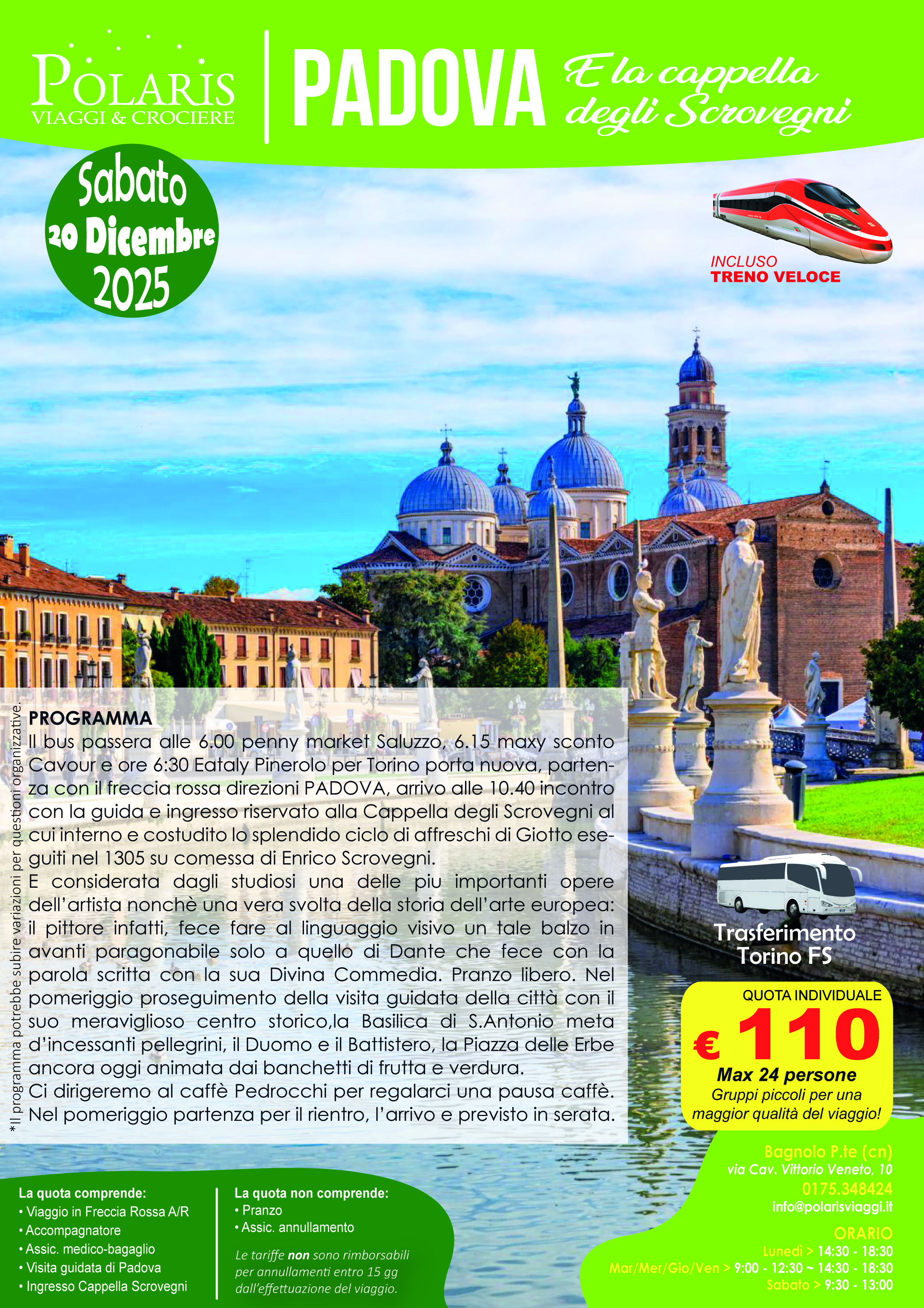 Il bus passera alle 6.00 penny market Saluzzo, 6.15 maxy sconto Cavour e ore 6:30 Eataly Pinerolo per Torino porta nuova, partenza con il freccia rossa direzioni PADOVA, arrivo alle 10.40 incontro con la guida e ingresso riservato alla Cappella degli Scrovegni al cui interno e costudito lo splendido ciclo di affreschi di Giotto eseguiti nel 1305 su comessa di Enrico Scrovegni.