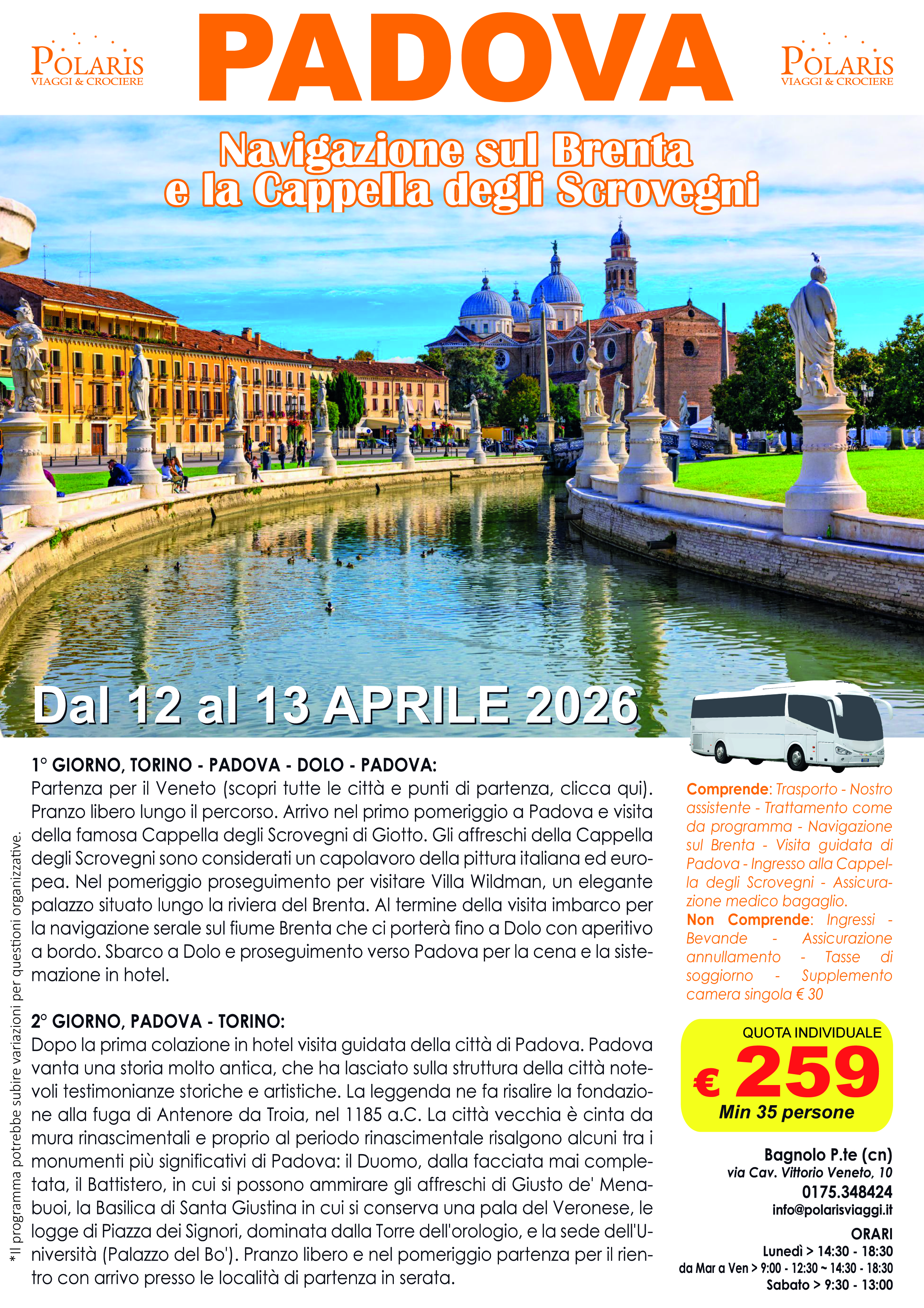 La quota comprende posto riservato nelle prime due file del bus. Il prezzo del biglietto è valido a titolo di acconto. Il saldo del viaggio può essere effettuato direttamente in agenzia o tramite Bonifico (IBAN: IT95P0200845950000100965234 - destinatario: PIANETA POLARIS DI BRUNO ALDO - causale: NOME E COGNOME + VIAGGIO + DATA VIAGGIO).