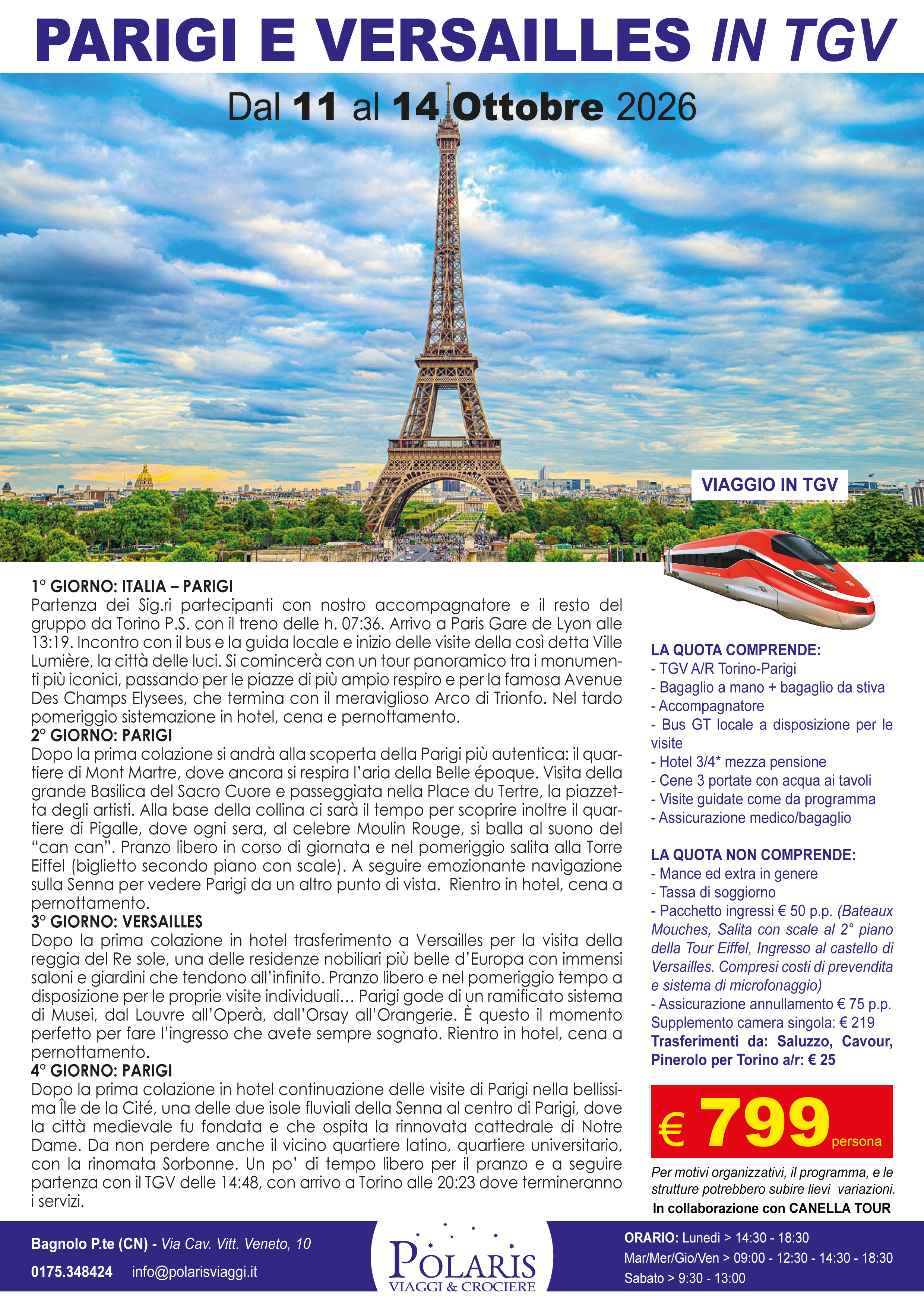 Partenza dei Sig.ri partecipanti con nostro accompagnatore e il resto del gruppo da Torino P.S. con il treno delle h. 07:36. Arrivo a Paris Gare de Lyon alle 13:19. Incontro con il bus e la guida locale e inizio delle visite della così detta Ville Lumière, la città delle luci. Si comincerà con un tour panoramico tra i monumenti più iconici, passando per le piazze di più ampio respiro e per la famosa Avenue Des Champs Elysees, che termina con il meraviglioso Arco di Trionfo. Nel tardo pomeriggio sistemazione in hotel, cena e pernottamento.