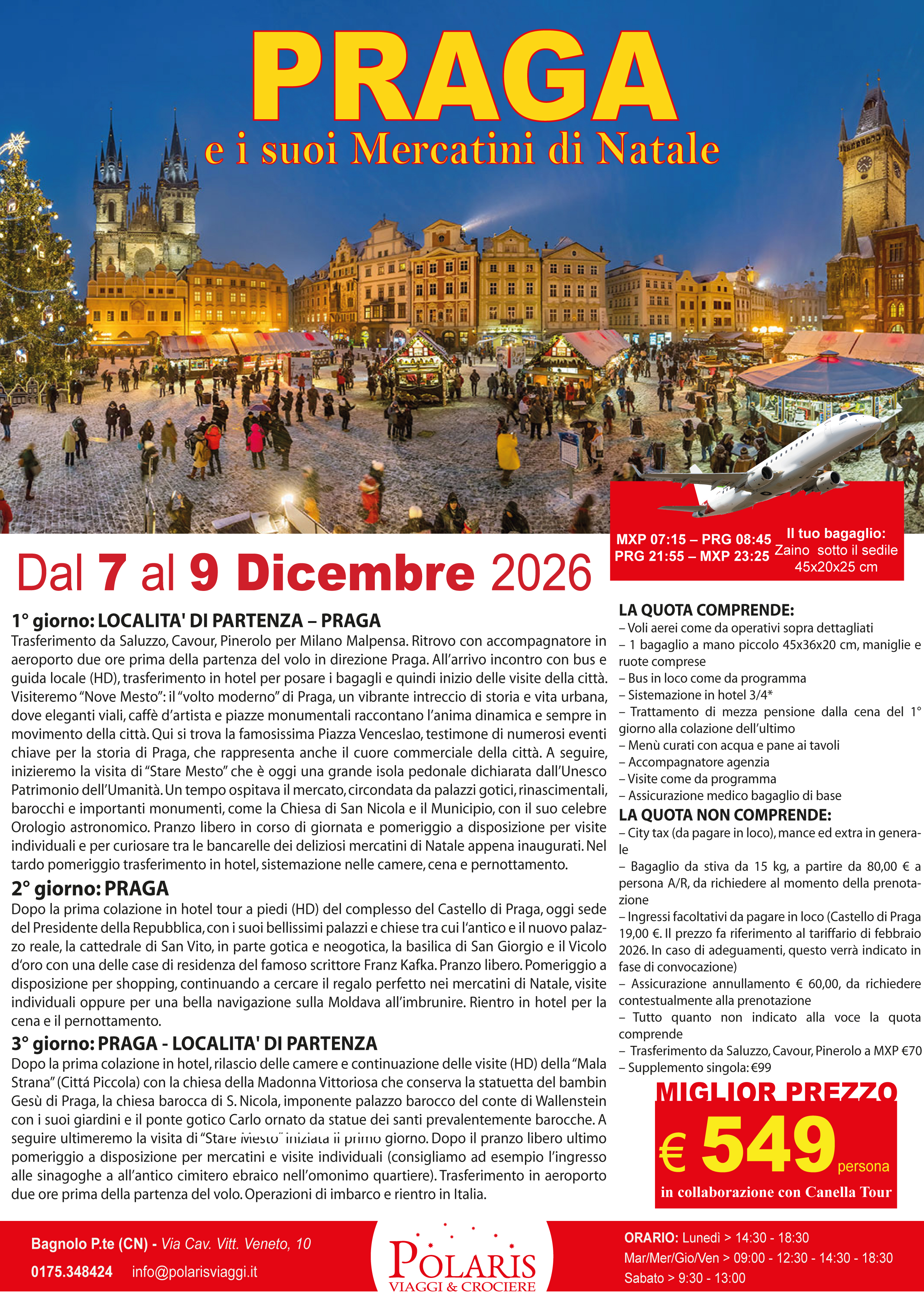 Trasferimento da Saluzzo, Cavour, Pinerolo per Milano Malpensa. Ritrovo con accompagnatore in aeroporto due ore prima della partenza del volo in direzione Praga. All’arrivo incontro con bus e guida locale (HD), trasferimento in hotel per posare i bagagli e quindi inizio delle visite della città. Visiteremo “Nove Mesto”: il “volto moderno” di Praga, un vibrante intreccio di storia e vita urbana, dove eleganti viali, caffè d’artista e piazze monumentali raccontano l’anima dinamica e sempre in movimento della città. Qui si trova la famosissima Piazza Venceslao, testimone di numerosi eventi chiave per la storia di Praga, che rappresenta anche il cuore commerciale della città. A seguire, inizieremo la visita di “Stare Mesto” che è oggi una grande isola pedonale dichiarata dall’Unesco Patrimonio dell’Umanità. Un tempo ospitava il mercato, circondata da palazzi gotici, rinascimentali, barocchi e importanti monumenti, come la Chies…