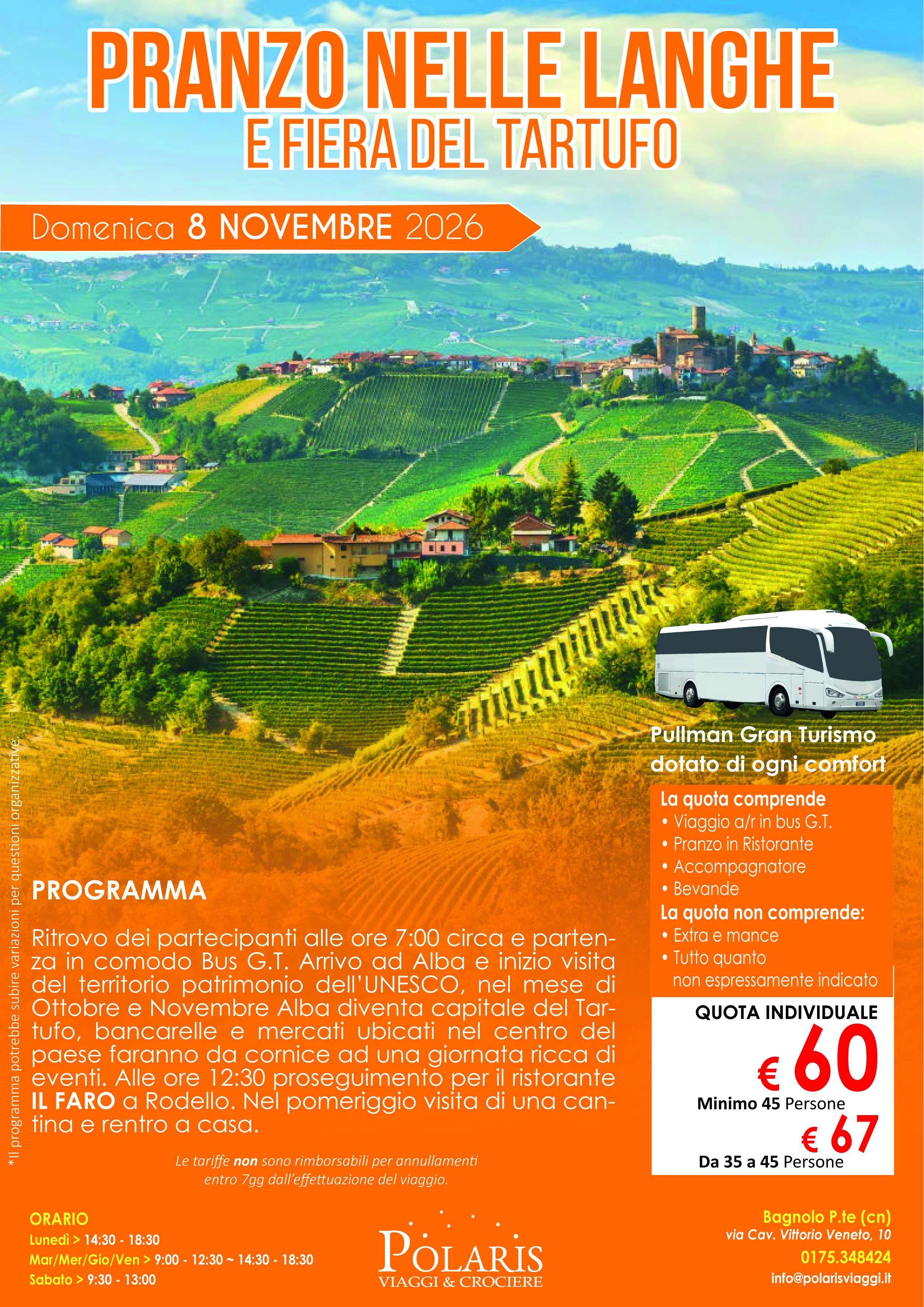 Ritrovo dei partecipanti alle ore 7:00 circa e partenza in comodo Bus G.T. Arrivo ad Alba e inizio visita del territorio patrimonio dell’UNESCO, nel mese di Ottobre e Novembre Alba diventa capitale del Tartufo, bancarelle e mercati ubicati nel centro del paese faranno da cornice ad una giornata ricca di eventi. Alle ore 12:30 proseguimento per il ristorante IL FARO a Rodello. Nel pomeriggio visita di una cantina e rentro a casa.