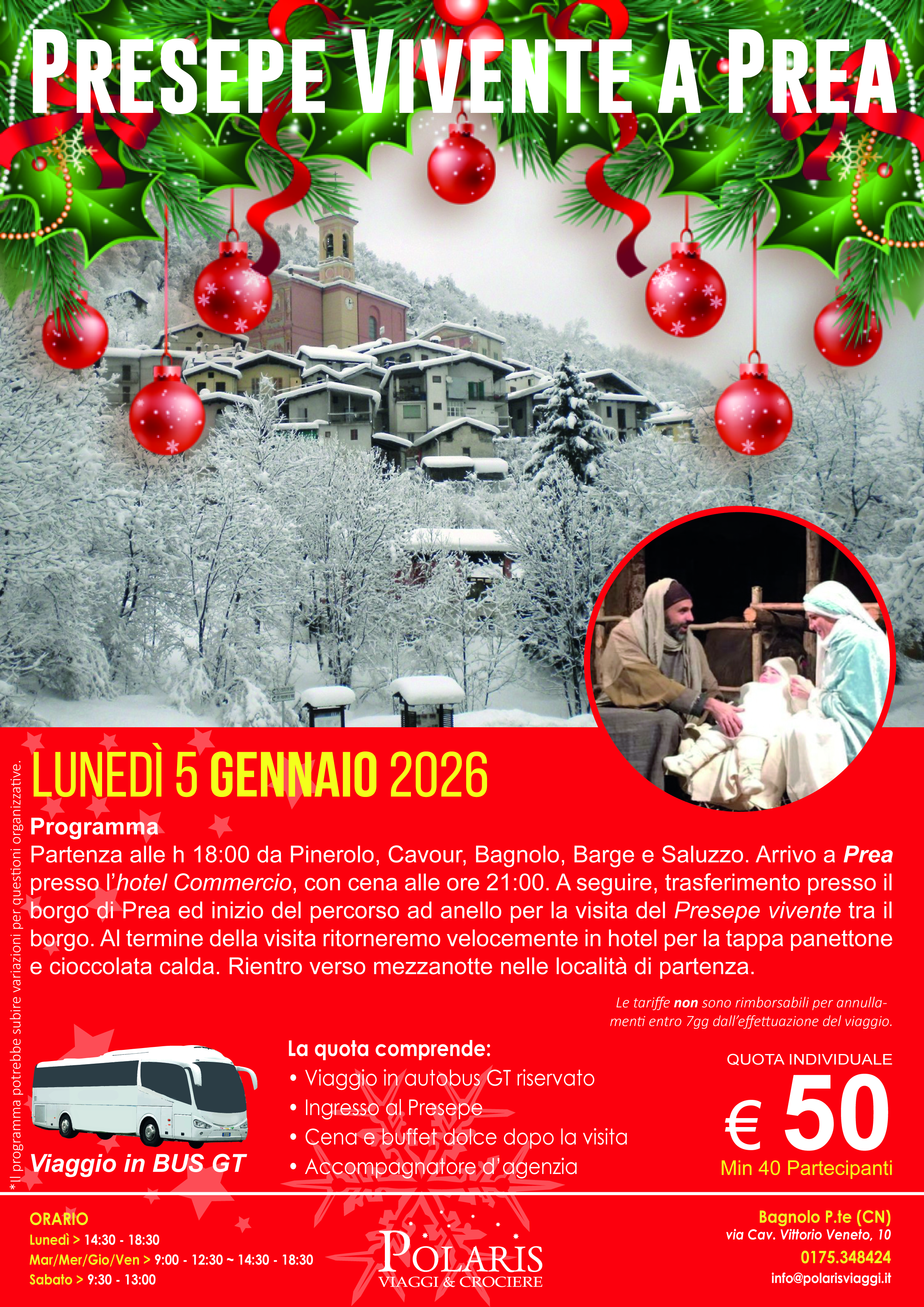 Partenza alle h 18:00 da Pinerolo, Cavour, Bagnolo, Barge e Saluzzo. Arrivo a Prea presso l’hotel Commercio, con cena alle ore 21:00. A seguire, trasferimento presso il borgo di Prea ed inizio del percorso ad anello per la visita del Presepe vivente tra il borgo. Al termine della visita ritorneremo velocemente in hotel per la tappa panettone e cioccolata calda. Rientro verso mezzanotte nelle località di partenza.