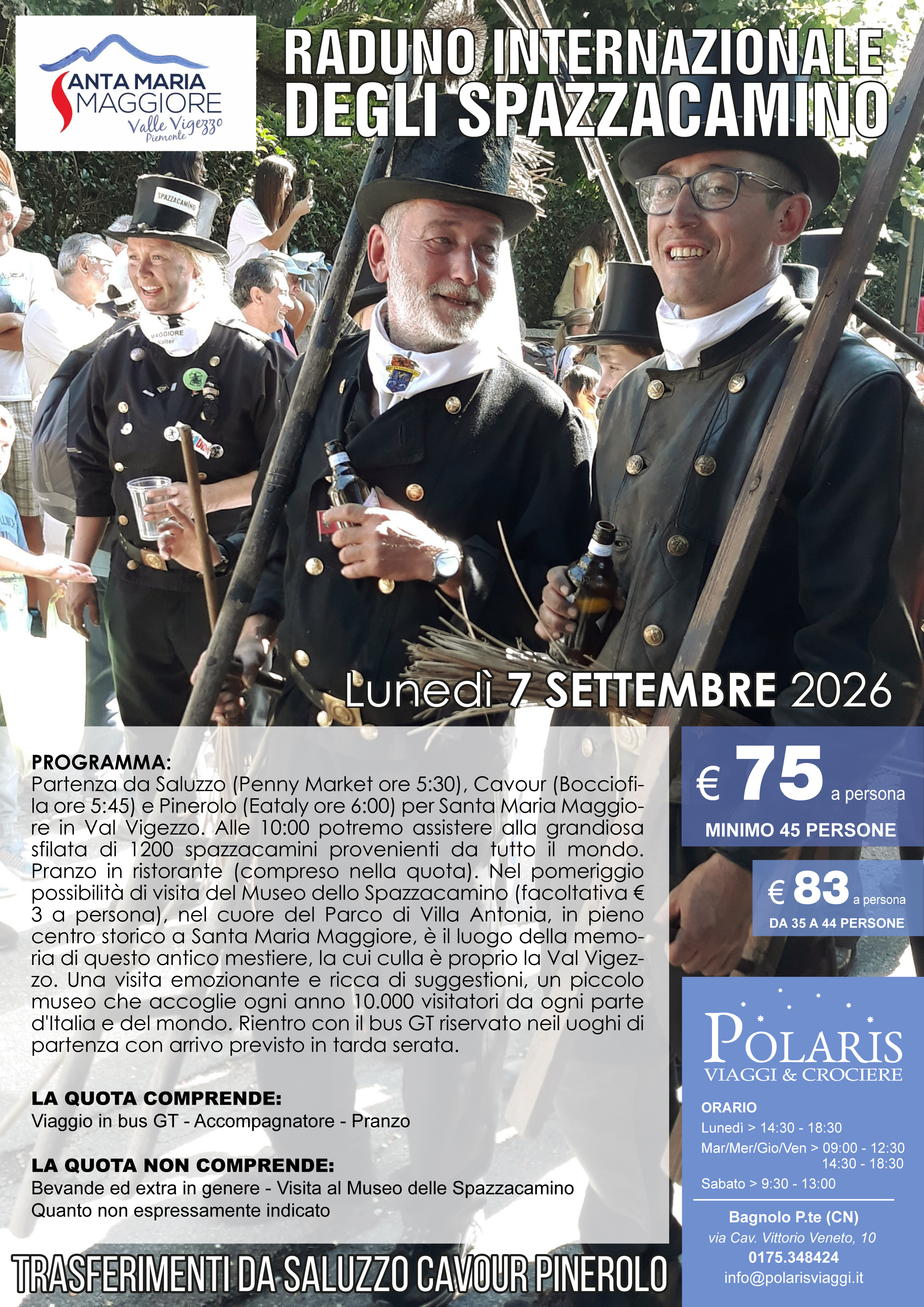 Partenza da Saluzzo (Penny Market ore 5:30), Cavour (Bocciofila ore 5:45) e Pinerolo (Eataly ore 6:00) per Santa Maria Maggiore in Val Vigezzo. Alle 10:00 potremo assistere alla grandiosa sfilata di 1200 spazzacamini provenienti da tutto il mondo. Pranzo in ristorante (compreso nella quota). Nel pomeriggio possibilità di visita del Museo dello Spazzacamino (facoltativa € 3 a persona), nel cuore del Parco di Villa Antonia, in pieno centro storico a Santa Maria Maggiore, è il luogo della memoria di questo antico mestiere, la cui culla è proprio la Val Vigezzo. Una visita emozionante e ricca di suggestioni, un piccolo museo che accoglie ogni anno 10.000 visitatori da ogni parte d'Italia e del mondo. Rientro con il bus GT riservato neil uoghi di partenza con arrivo previsto in tarda serata.