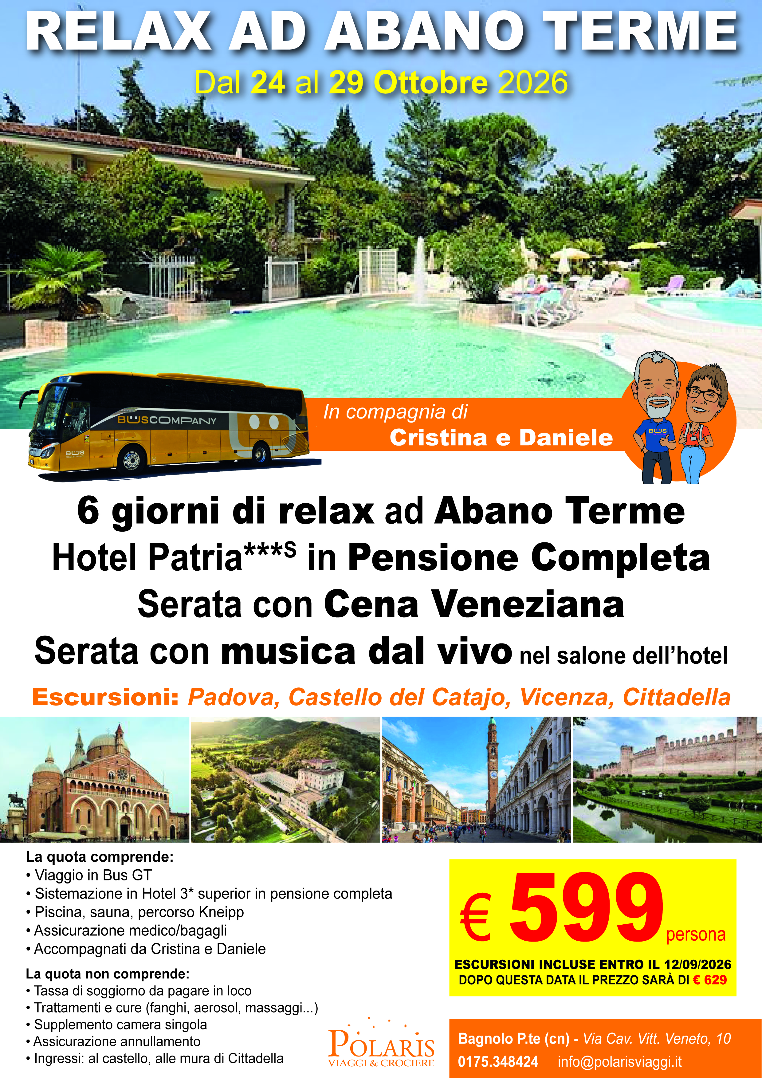 La quota comprende posto riservato nelle prime due file del bus. Il prezzo del biglietto è valido a titolo di acconto. Il saldo del viaggio può essere effettuato direttamente in agenzia o tramite Bonifico (IBAN: IT95P0200845950000100965234 - destinatario: PIANETA POLARIS DI BRUNO ALDO - causale: NOME E COGNOME + VIAGGIO + DATA VIAGGIO).