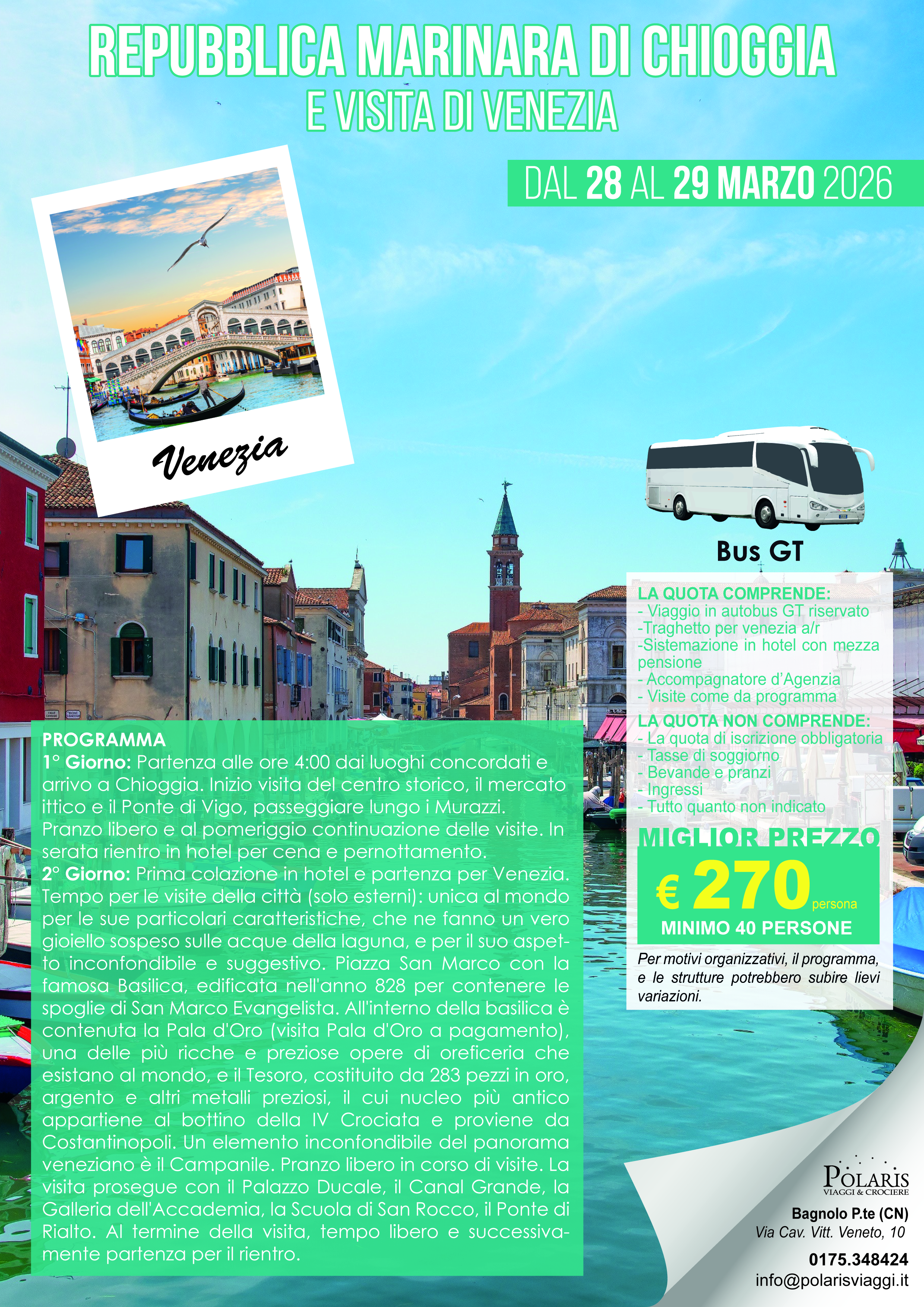 1° Giorno: Partenza alle ore 4:00 dai luoghi concordati e arrivo a Chioggia. Inizio visita del centro storico, il mercato ittico e il Ponte di Vigo, passeggiare lungo i Murazzi. Pranzo libero e al pomeriggio continuazione delle visite. In serata rientro in hotel per cena e pernottamento.