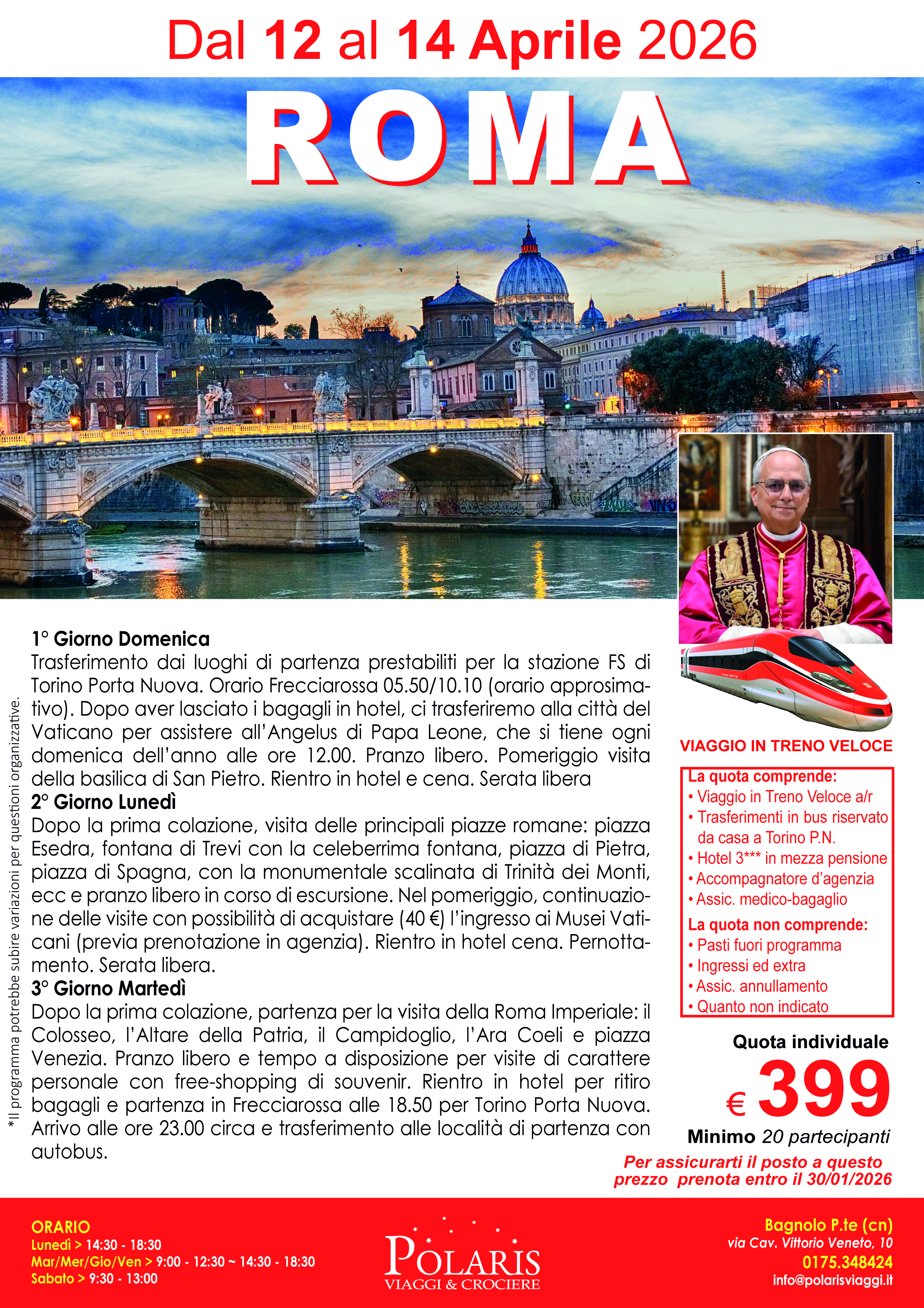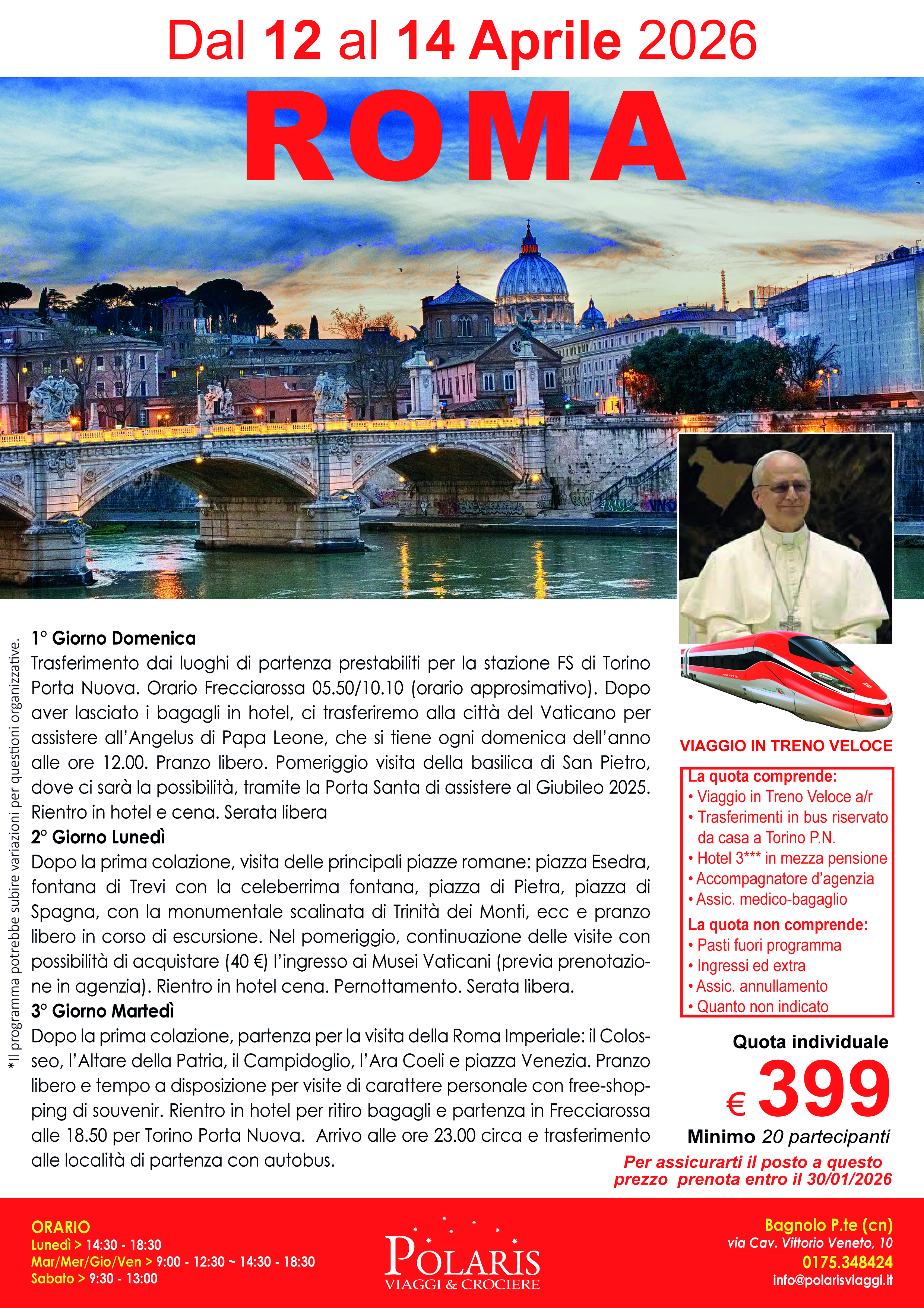 Trasferimento dai luoghi di partenza prestabiliti per la stazione FS di Torino Porta Nuova. Orario Frecciarossa 05.50/10.10 (orario approsimativo). Dopo aver lasciato i bagagli in hotel, ci trasferiremo alla città del Vaticano per assistere all’Angelus di Papa Leone, che si tiene ogni domenica dell’anno alle ore 12.00. Pranzo libero. Pomeriggio visita della basilica di San Pietro, dove ci sarà la possibilità, tramite la Porta Santa di assistere al Giubileo 2025. Rientro in hotel e cena. Serata libera