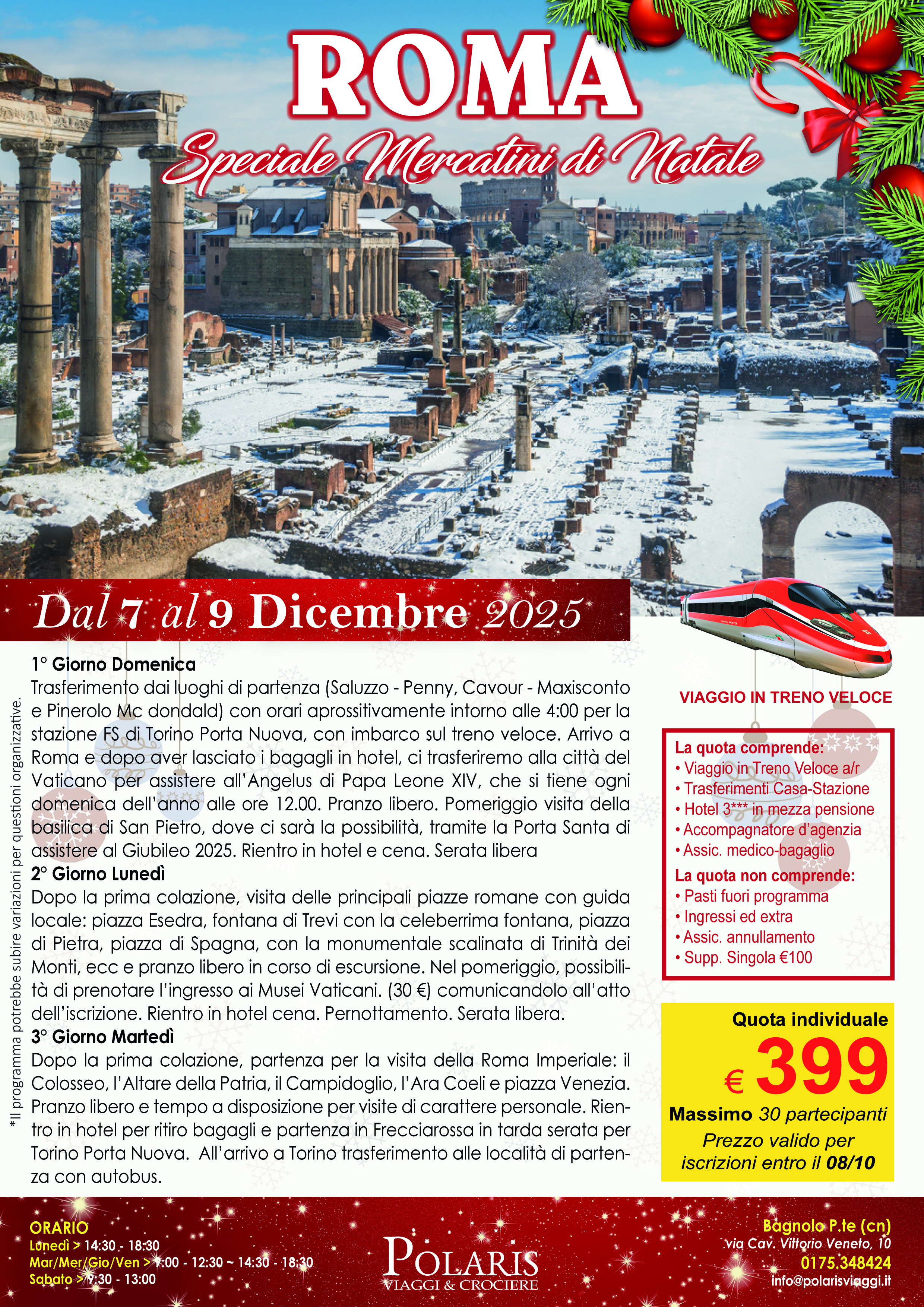Trasferimento dai luoghi di partenza (Saluzzo - Penny, Cavour - Maxisconto e Pinerolo Mc dondald) con orari aprossitivamente intorno alle 4:00 per la stazione FS di Torino Porta Nuova, con imbarco sul treno veloce. Arrivo a Roma e dopo aver lasciato i bagagli in hotel, ci trasferiremo alla città del Vaticano per assistere all’Angelus di Papa Leone XIV, che si tiene ogni domenica dell’anno alle ore 12.00. Pranzo libero. Pomeriggio visita della basilica di San Pietro, dove ci sarà la possibilità, tramite la Porta Santa di assistere al Giubileo 2025. Rientro in hotel e cena. Serata libera