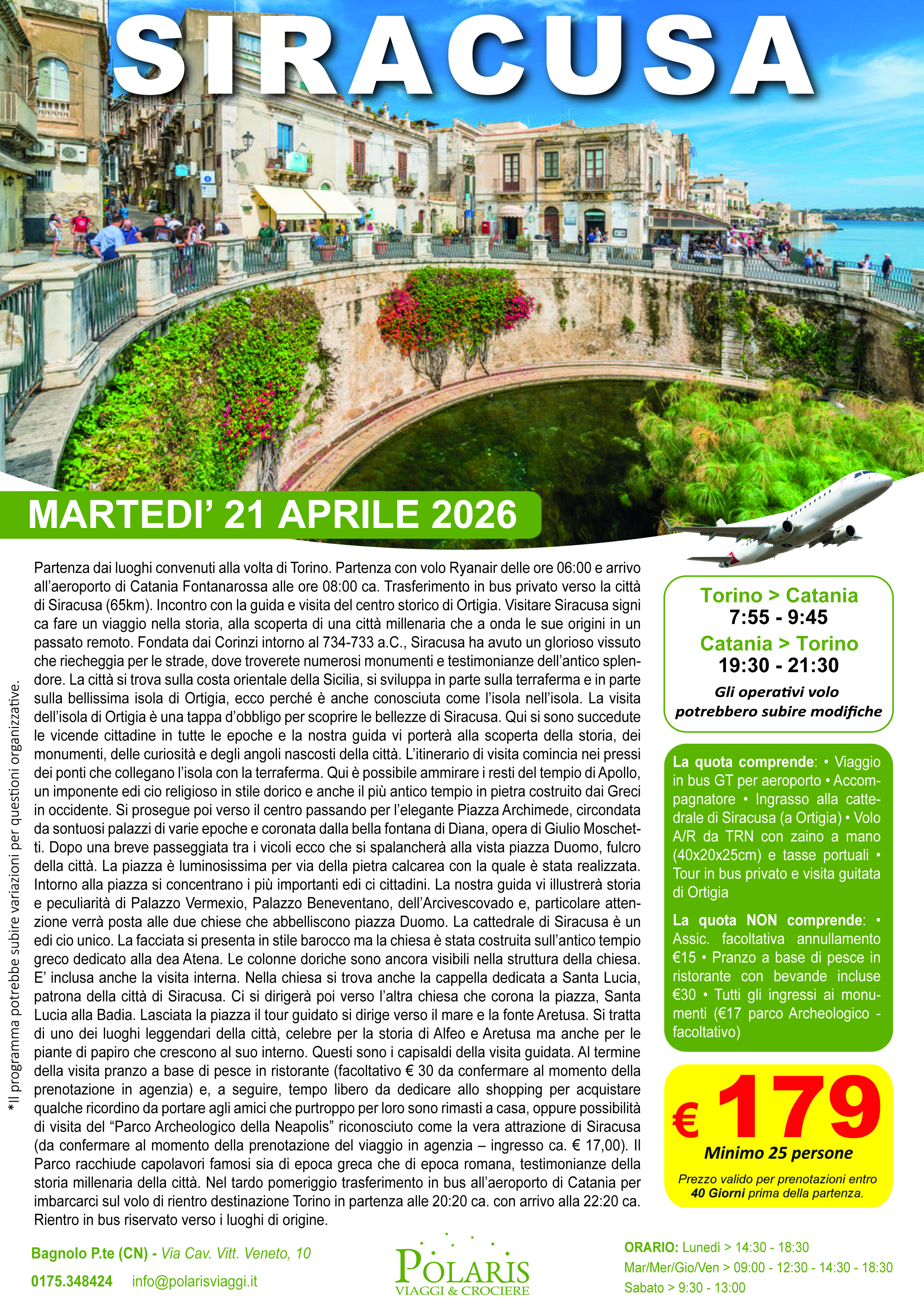 Partenza dai luoghi convenuti alla volta di Torino. Partenza con volo Ryanair delle ore 06:00 e arrivo all’aeroporto di Catania Fontanarossa alle ore 08:00 ca. Trasferimento in bus privato verso la città di Siracusa (65km). Incontro con la guida e visita del centro storico di Ortigia. Visitare Siracusa signi ca fare un viaggio nella storia, alla scoperta di una città millenaria che a onda le sue origini in un passato remoto. Fondata dai Corinzi intorno al 734-733 a.C., Siracusa ha avuto un glorioso vissuto che riecheggia per le strade, dove troverete numerosi monumenti e testimonianze dell’antico splendore. La città si trova sulla costa orientale della Sicilia, si sviluppa in parte sulla terraferma e in parte sulla bellissima isola di Ortigia, ecco perché è anche conosciuta come l’isola nell’isola. La visita dell’isola di Ortigia è una tappa d’obbligo per scoprire le bellezze di Siracusa. Qui si sono…