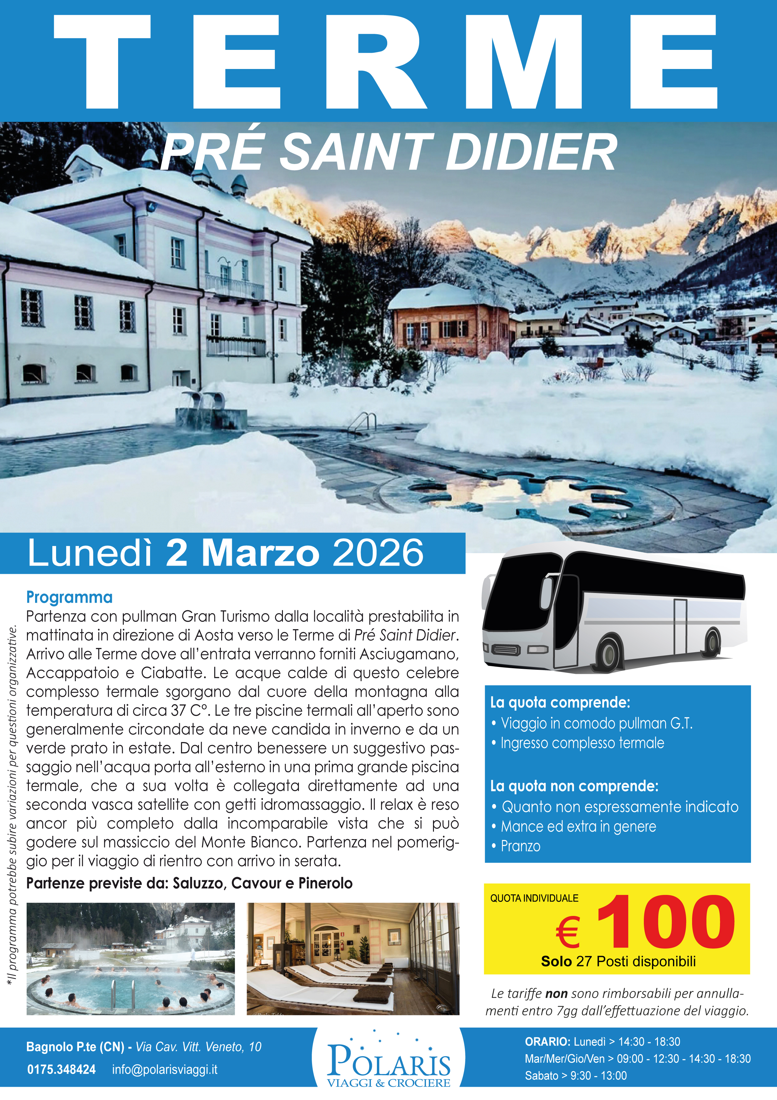 Partenza con pullman Gran Turismo dalla località prestabilita in mattinata in direzione di Aosta verso le Terme di Pré Saint Didier. Arrivo alle Terme dove all’entrata verranno forniti Asciugamano, Accappatoio e Ciabatte. Le acque calde di questo celebre complesso termale sgorgano dal cuore della montagna alla temperatura di circa 37 C°. Le tre piscine termali all’aperto sono generalmente circondate da neve candida in inverno e da un verde prato in estate. Dal centro benessere un suggestivo passaggio nell’acqua porta all’esterno in una prima grande piscina termale, che a sua volta è collegata direttamente ad una seconda vasca satellite con getti idromassaggio. Il relax è reso ancor più completo dalla incomparabile vista che si può godere sul massiccio del Monte Bianco. Partenza nel pomeriggio per il viaggio di rientro con arrivo in serata.