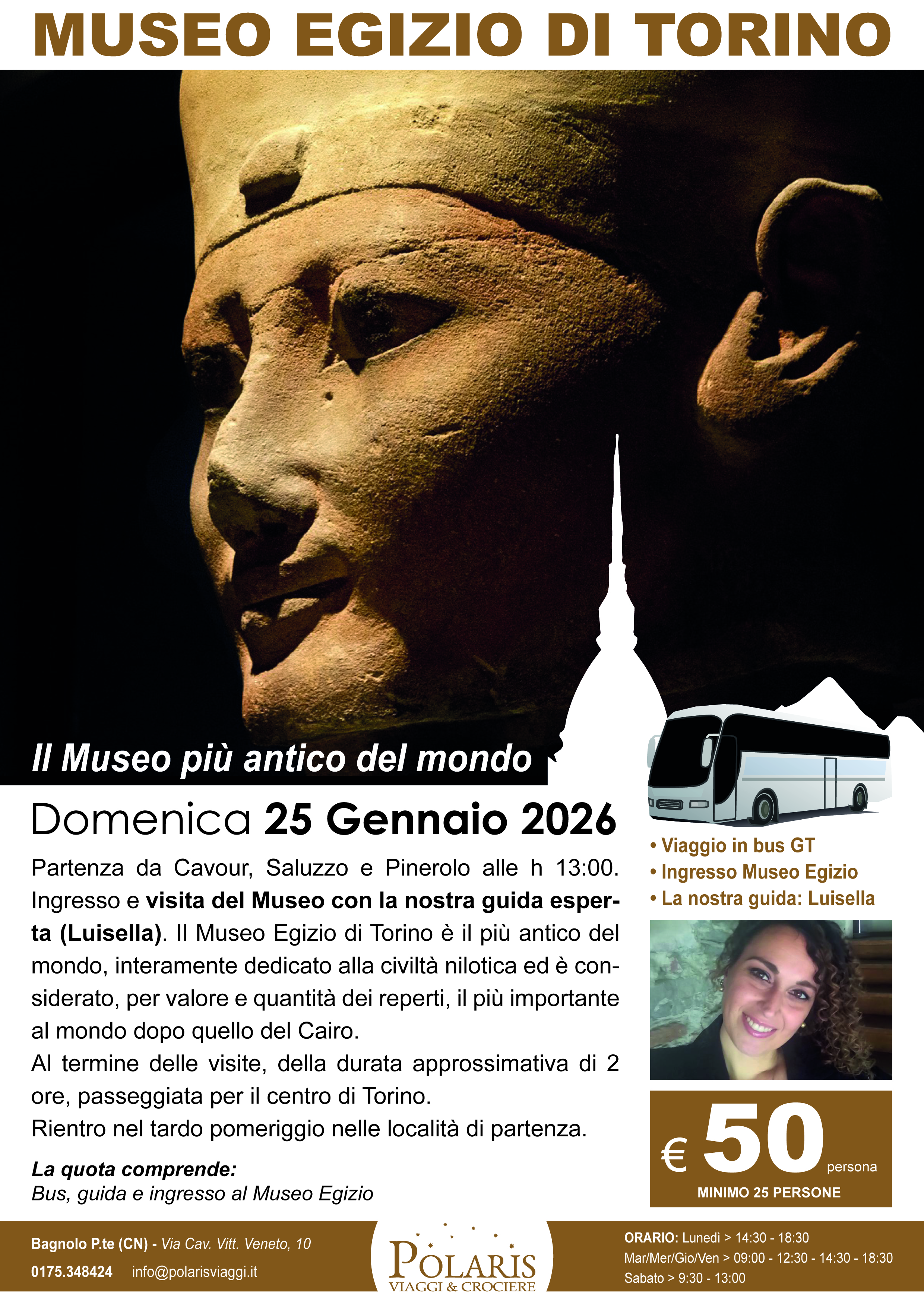 Partenza da Cavour, Saluzzo e Pinerolo alle h 13:00. Ingresso e visita del Museo con la nostra guida esperta (Luisella). Il Museo Egizio di Torino è il più antico del mondo, interamente dedicato alla civiltà nilotica ed è considerato, per valore e quantità dei reperti, il più importante al mondo dopo quello del Cairo.