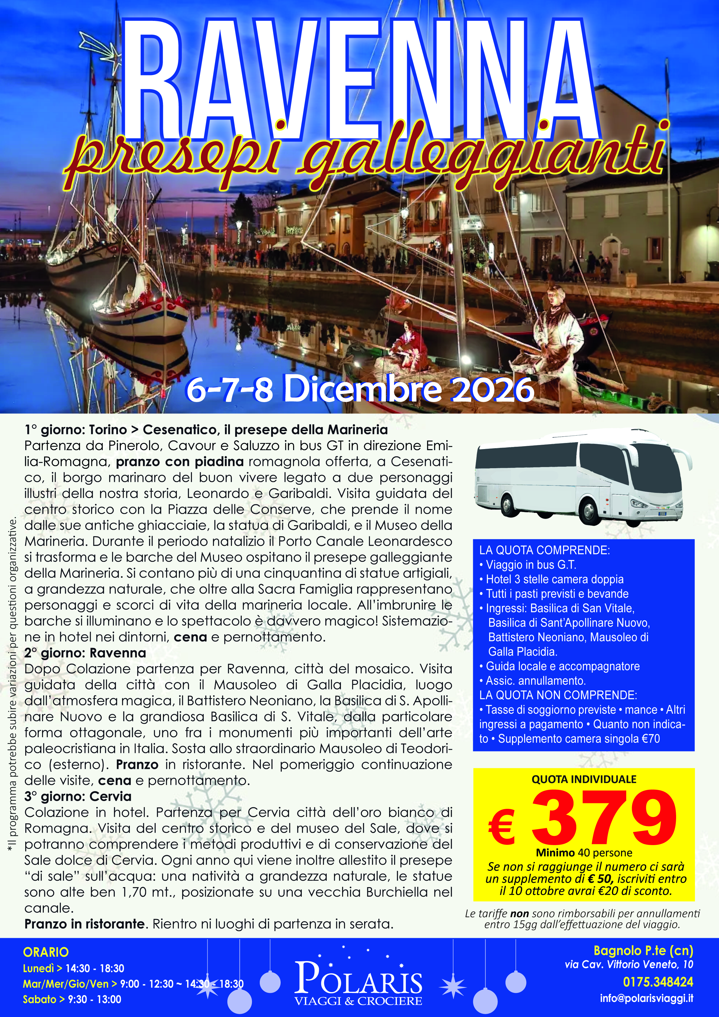 Partenza da Pinerolo, Cavour e Saluzzo in bus GT in direzione Emilia-Romagna, pranzo con piadina romagnola offerta, a Cesenatico, il borgo marinaro del buon vivere legato a due personaggi illustri della nostra storia, Leonardo e Garibaldi. Visita guidata del centro storico con la Piazza delle Conserve, che prende il nome dalle sue antiche ghiacciaie, la statua di Garibaldi, e il Museo della Marineria. Durante il periodo natalizio il Porto Canale Leonardesco si trasforma e le barche del Museo ospitano il presepe galleggiante della Marineria. Si contano più di una cinquantina di statue artigiali, a grandezza naturale, che oltre alla Sacra Famiglia rappresentano personaggi e scorci di vita della marineria locale. All’imbrunire le barche si illuminano e lo spettacolo è davvero magico! Sistemazione in hotel nei dintorni, cena e pernottamento.