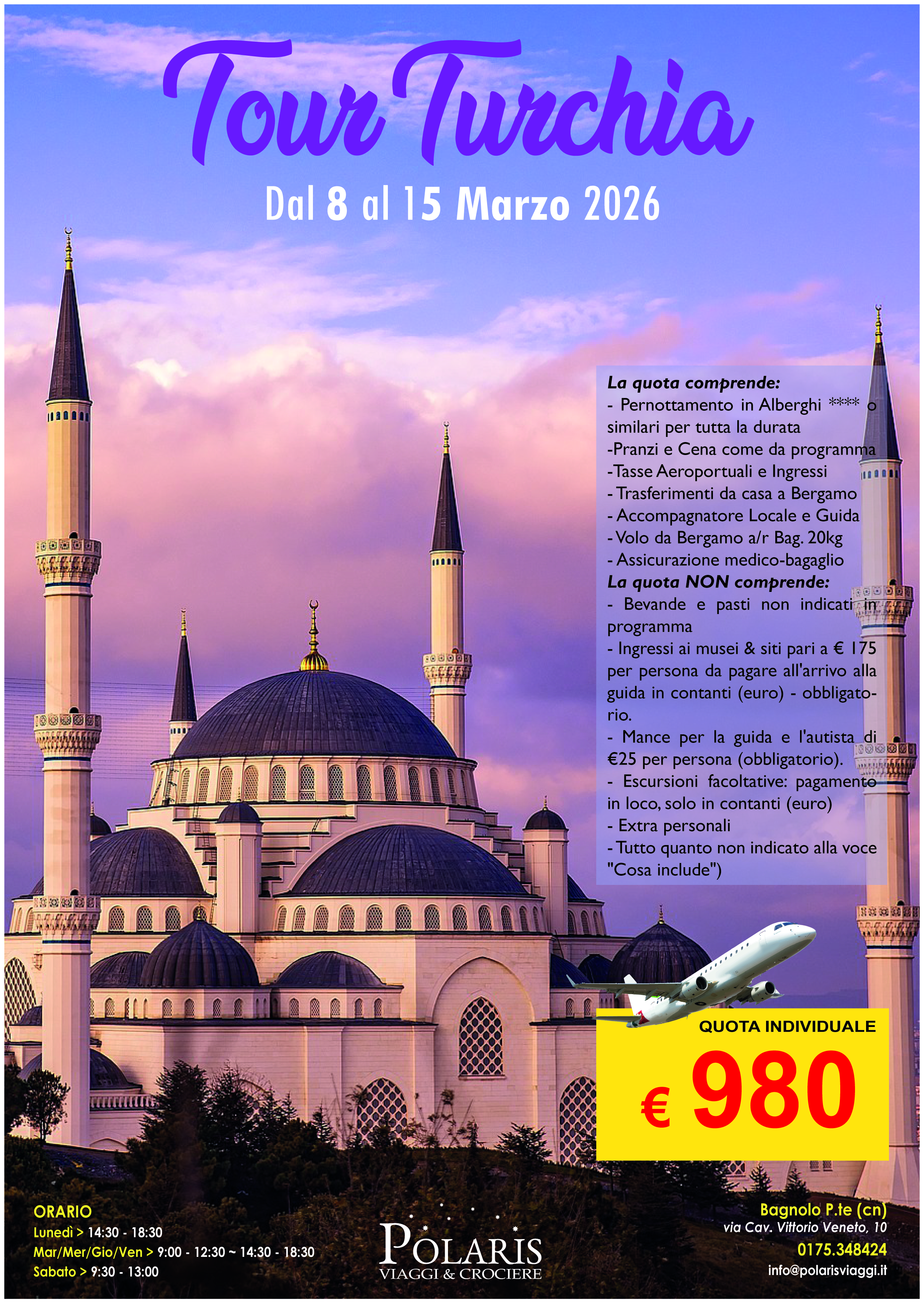 Il prezzo del biglietto è valido a titolo di acconto. Il saldo del viaggio può essere effettuato direttamente in agenzia o tramite Bonifico (IBAN: IT95P0200845950000100965234 - destinatario: PIANETA POLARIS DI BRUNO ALDO - causale: NOME E COGNOME + VIAGGIO + DATA VIAGGIO).